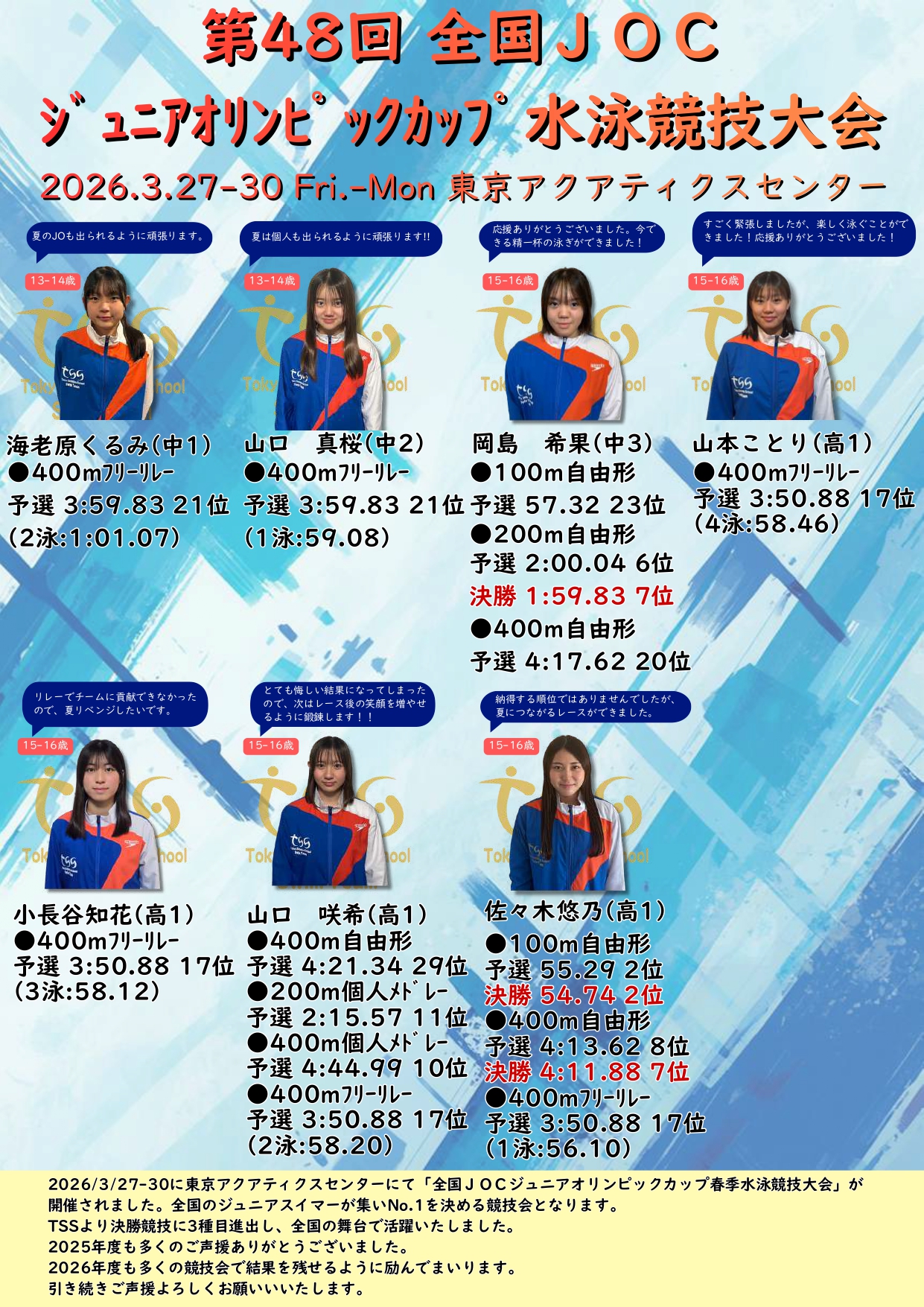 2026/3/27-30に東京アクアティクスセンターにて「全国JOCジュニアオリンピックカップ春季水泳競技大会」が開催されました。