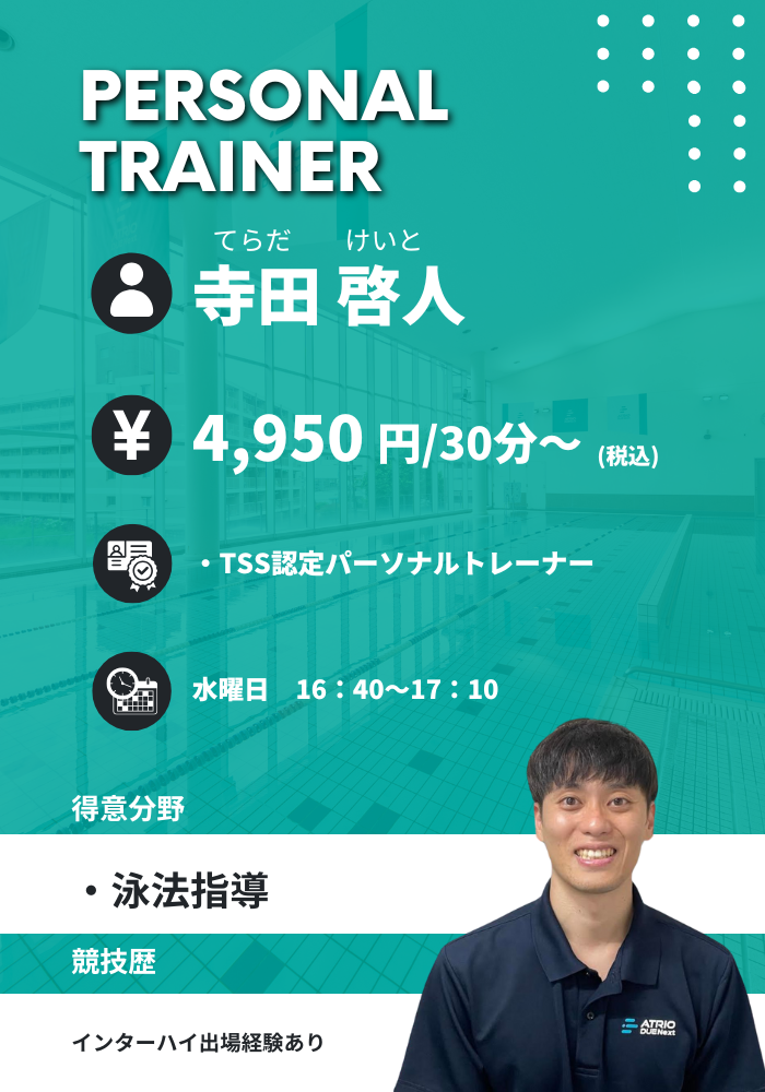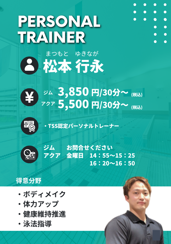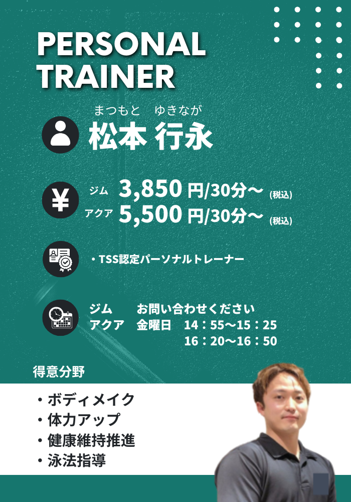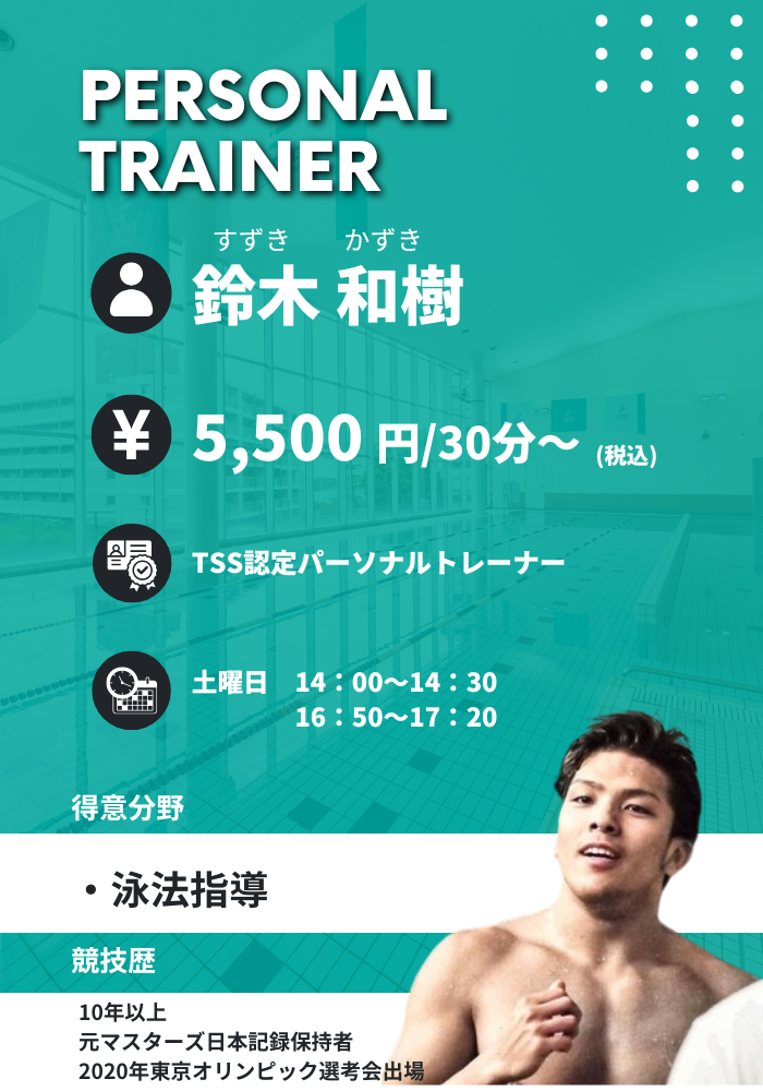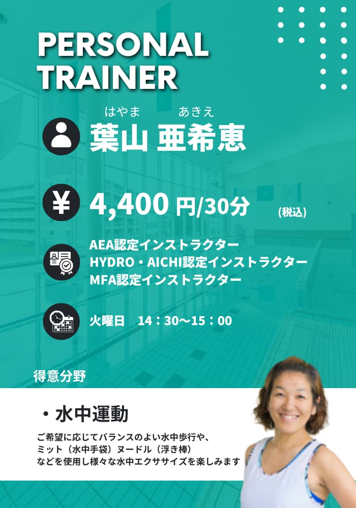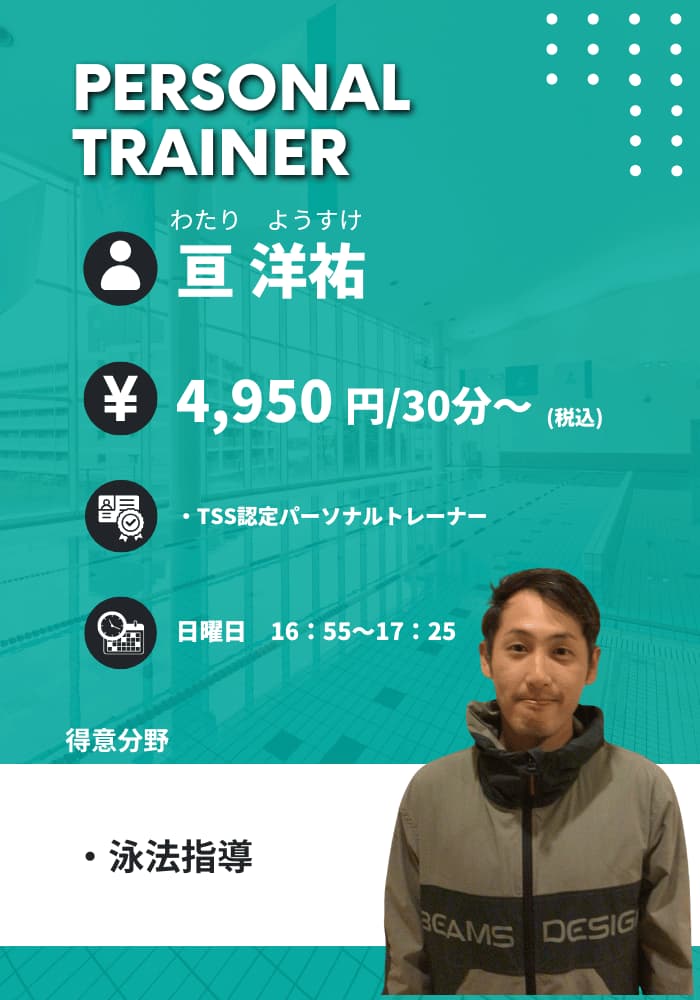 パーソナルトレーニングとは、トレーナーとのマンツーマンでのトレーニング指導のことです。ダイエット、コンディショニング、筋力アップ、ボディメイク、泳法指導等、お客様の目的に合わせた運動プログラムの作成とトレーニング指導を行います。