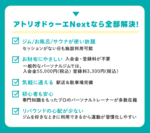東急グループのフィットネスクラブ・アトリオドゥーエNextでは、パーソナルトレーニングと3ヶ月間ジム通い放題がセットになった、お得な「パーソナルトレーニング  3ヶ月集中コース」を好評販売中!プロのパーソナルトレーニングを業界最安値級のお手頃価格でご提供いたします。