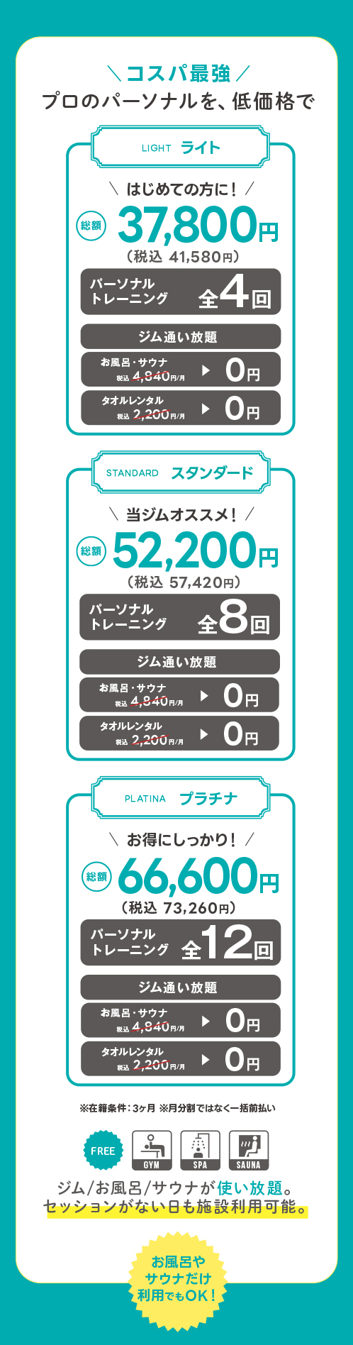 ※本商品には、各プラン指定回数のパーソナルトレーニング(1回45分)、ジムエリア・お風呂(サウナ含む)・ロッカールーム・タオルセットの3ヶ月間の利用が含まれます。