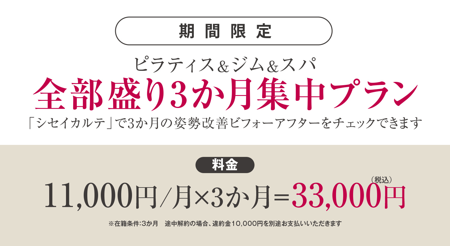 ・24時間ジム利用可能 ・月4回のマシンピラティスレッスンに参加可能 |