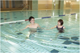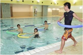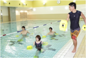 水の中で無理なくエクササイズ。 水中での浮力を利用し、足・腰に無理なく楽しく脂肪燃焼&筋力向上できるアクアエクササイズ。初心者~中級者向けのレベル別スイムレッスン人気です。