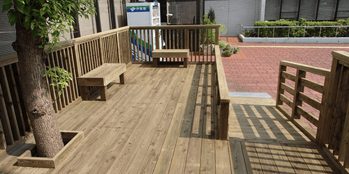 中村:そうですね。弊社のルーツは、明治20年(1887年)に創業された静岡の材木屋にあります。木材については幅広い知識とノウハウを受け継いでます。また1982年には、いち早くACQ加圧注入防腐処理プラントを導入して、木材の高耐久化事業を始めました。ACQ加圧注入材というのは、ACQという薬剤を木材の中に加圧注入して、腐りにくくしたりシロアリに喰われにくくしたものです。当初は住宅用建材として出荷してましたが、一般住宅だけでなく、公園、遊具などの公共施設にも使われていくようになったんです。