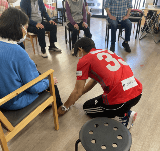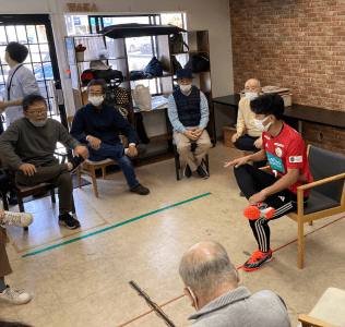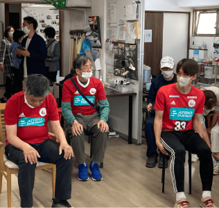 記念すべき最初の取り組みは、横浜市唯一の若年性認知症者支援事業所「GrASP」様に訪問し、座って出来る健康プログラムをトップチーム天本選手、谷選手が行いました! 温かい出迎えをしていただき、緊張していた2人の選手も楽しくプログラムを行う事ができました!