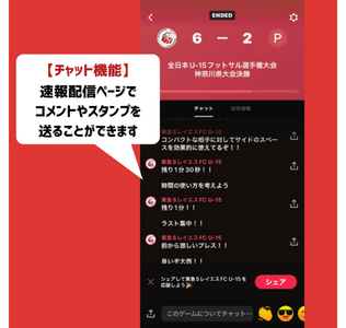 トップチームの公式戦では、レイエス広報スタッフによる“テキスト&写真でのライブ配信”を行っています。なかなか試合会場に足を運ぶことが難しい方もいらっしゃると思います。会場にお越しできない方は、アプリでチームや選手へメッセージも送れますので、是非ともアプリ応援でパワーを届けてください!一緒に試合を戦いましょう!