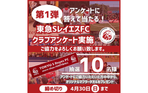このたび、皆さまからのご意見をお聞かせいただく、お客様アンケートを実施することになりました。アンケートにご協力いただいた方の中から抽選で10名様に東急SレイエスFCオリジナルマフラータオルをプレゼント!