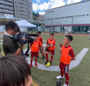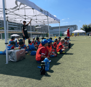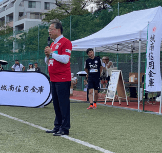 7月29日のイベントから対象は変わり、今回は東急Sレイエス フットボールスクールの選抜コースに所属する3〜6年生の選手を対象に開催しました。また特別招待チームとしまして、近隣地域で活動する久本SCの皆さんにもご参加頂き、8人制の交流試合を行いました。総勢100名の子どもたちが参加し、またイッツコムの撮影も入り、華やかさも増し、とても盛り上がったイベントとなりました。駆けつけてくださった城南信用金庫の川本理事長からは、「私たちは地元の金融機関として、子どもたちの役に立ちたいと考えています。誰か大人になったら一緒に働いてくれたらうれしいな」と呼びかけました。大会では、黄色のユニホームに身を包んだ城南信用金庫サッカー部メンバーもサポートしてくださいました。参加した子どもたちの中には、城南信用金庫様の存在をしっかり心に刻んでくれたことでしょう。