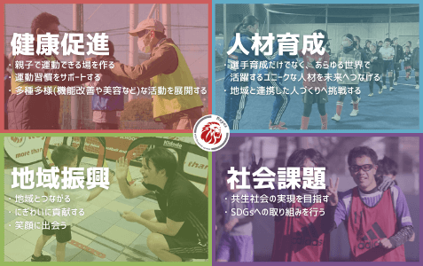 フットボールや様々な運動機会を中心に、子どもから大人まで、あらゆる世代の地域の方々と様々な絆を作り、出会いと成長を支援していく活動です。