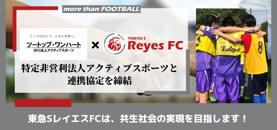 東急SレイエスFCは、特定非営利法人アクティブスポーツとの連携しながら、知的障害者支援や共生社会の充実した街づくり促進に取り組んで、志を共に歩んで参ります。
