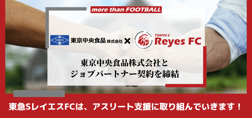 業務用食品の販売、米穀類販売、業務用食品の生産・販売を展開している東京中央食品株式会社(代表取締役社長 狩野憲彰)と東急SレイエスFCは、東急スポーツシステム株式会社 のフットボール事業における選手及びスタッフの就労支援を目的とした、2025-2026シーズンのジョブパートナー契約を締結。