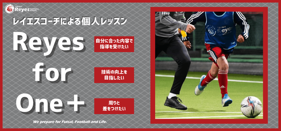 東急Sレイエス フットボールスクール 池袋では、個別に自分に合った内容で指導を受けたい、短期集中で技術の向上を目指したい、都合がいい時間にコーチの指導を受けたい、そんな希望を叶える個人レッスン『Reyes for One+』を開催いたします。