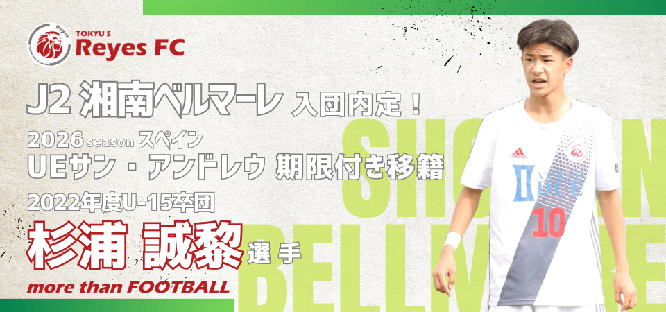 2022年度のレイエス U-15 卒団生である杉浦 誠黎選手がJ2所属の「湘南ベルマーレ」に入団内定いたしました!また2026シーズンはUEサン・アンドレウ(スペイン)へ期限付き移籍いたします。