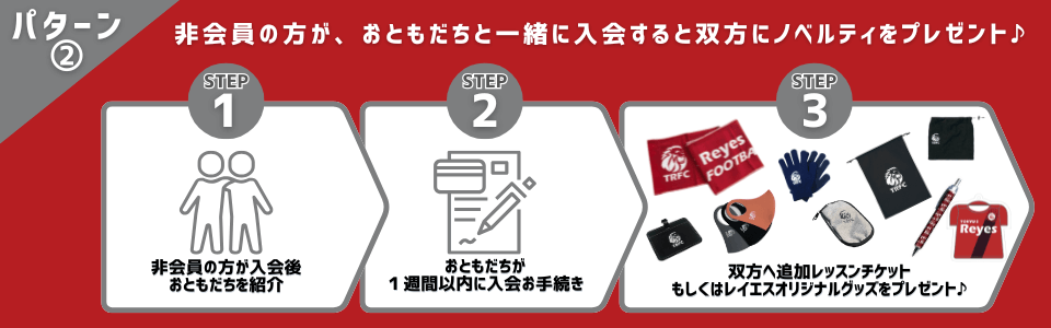 2025年10~12月中にスクールに在籍しているお子様がまだ通っていないお子様をご紹介して入会するか、まだスクールに通っていないお子様同士で1週間以内にご入会していただくと、特典をプレゼントいたします。