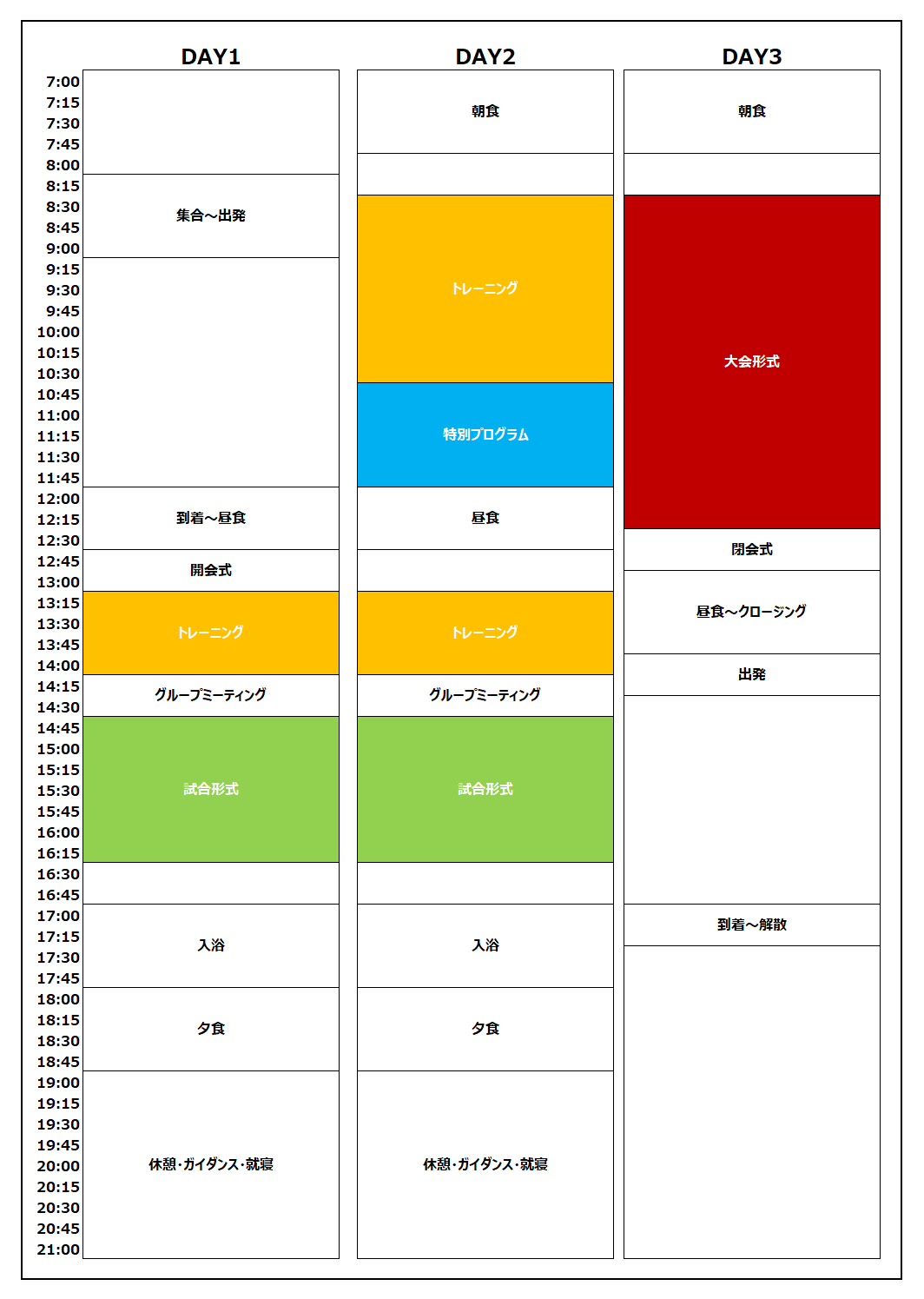 参加者をグループに分けて、1日の前半はトレーニングを行い、後半はゲームで練習の成果を発揮できるようにします。