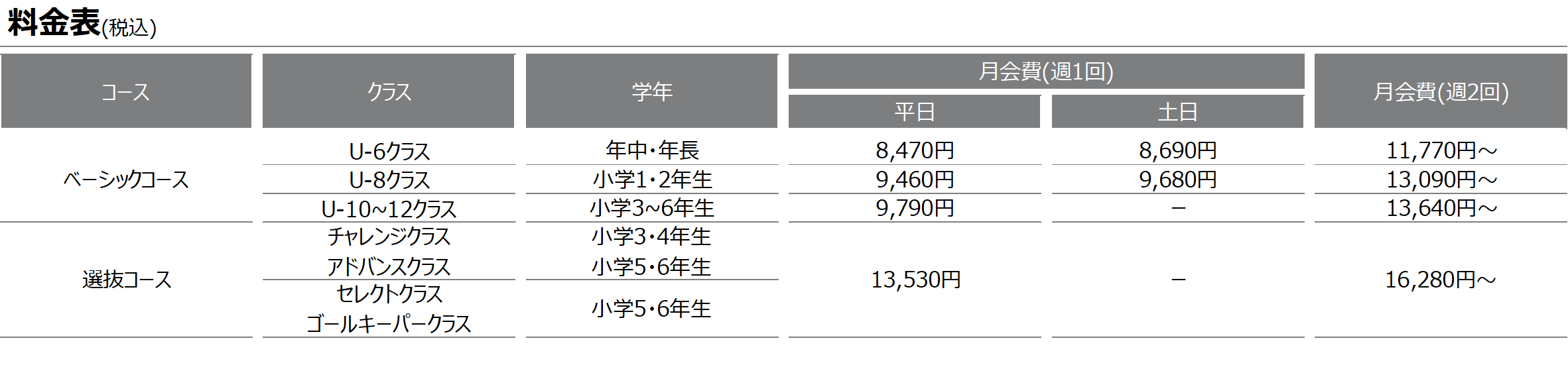 ・新規入会の方は、別途ソックス:2,530円(税別)とジャージ上:7,920円(税別)~の購入が必須となります。