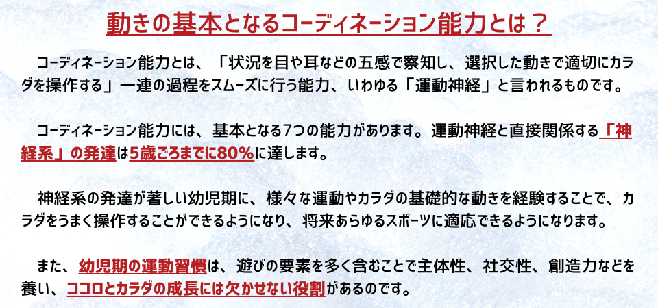 ウォーミングアップ・主運動・クールダウンの3パートにて、初めてのお子様でも楽しくボールを使って運動できるプログラムを行います。