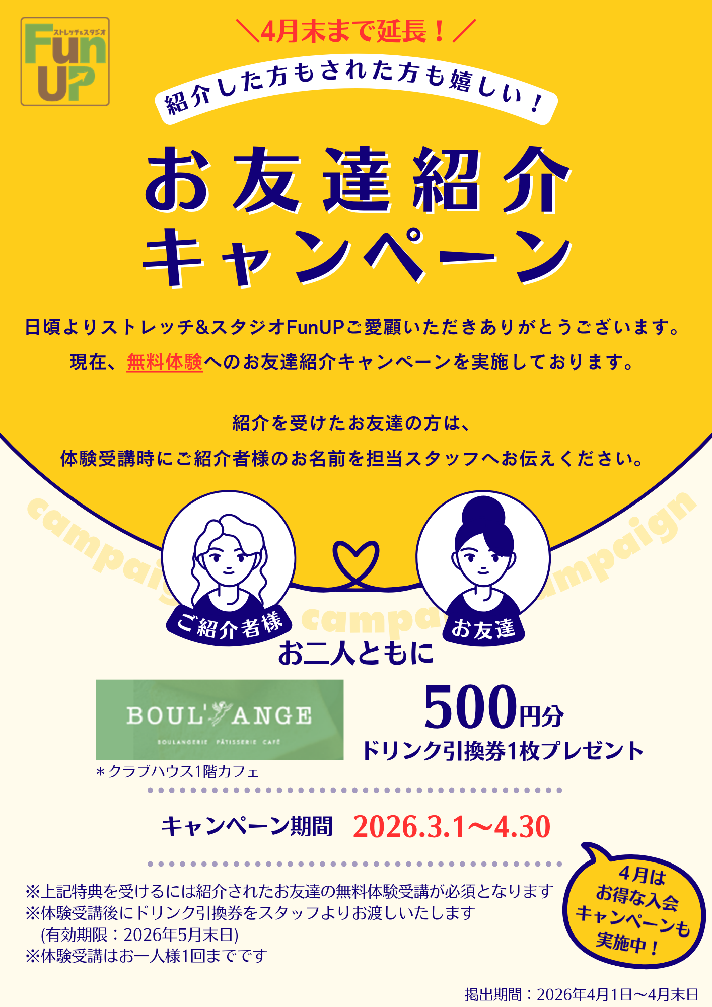 4月末までの期間限定でお友達紹介キャンペーンを実施いたします!