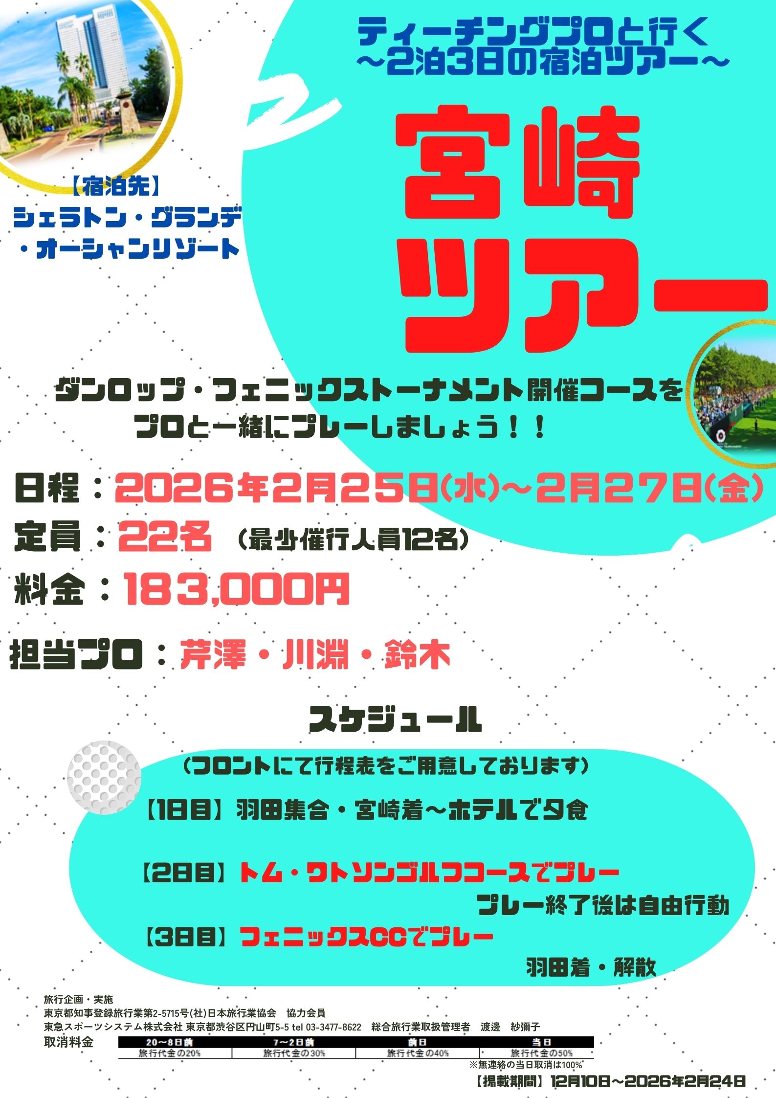 ティーチングプロと一緒に行く宿泊型イベント「宮崎ツアー」開催のお知らせです。