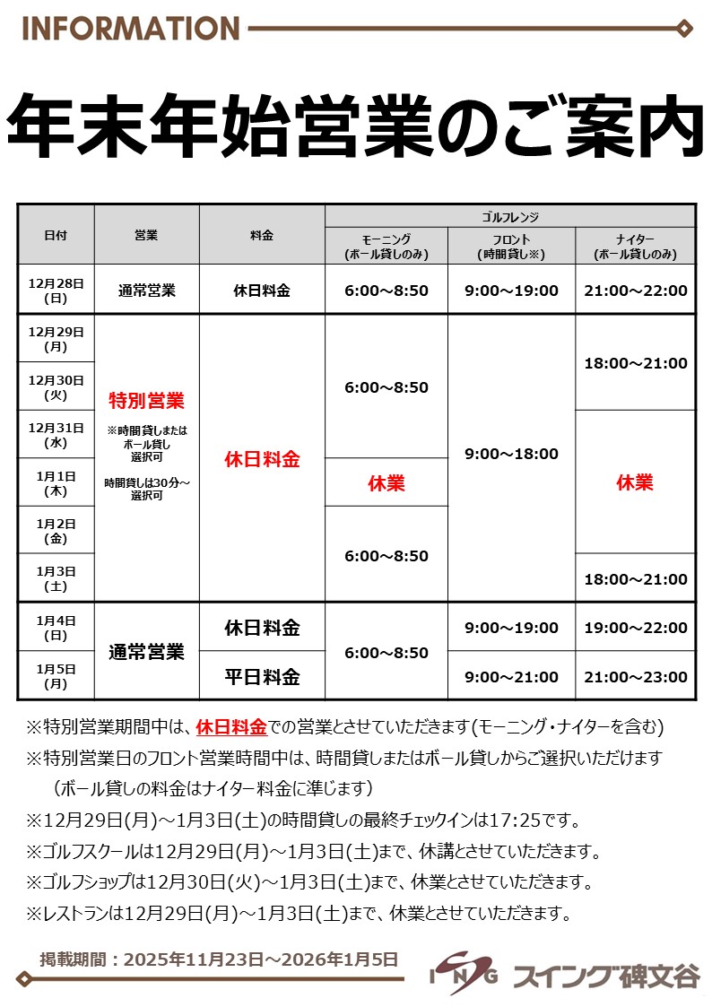 2025年12月28日(日)~2026年1月5日(月)の営業時間や料金につきまして、下記の通りご案内いたします。