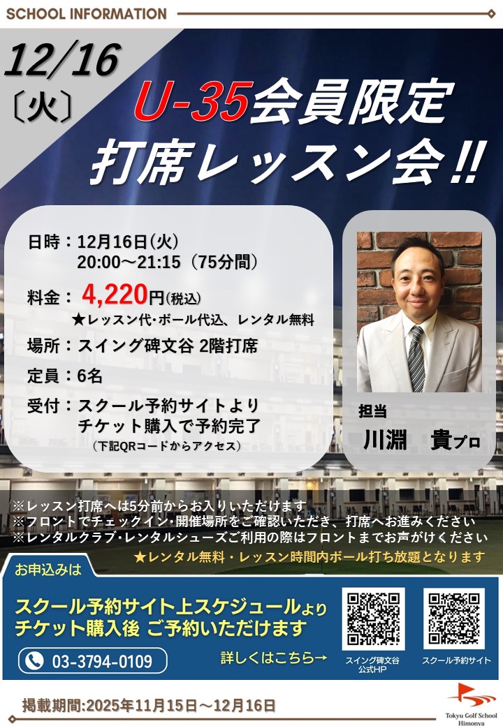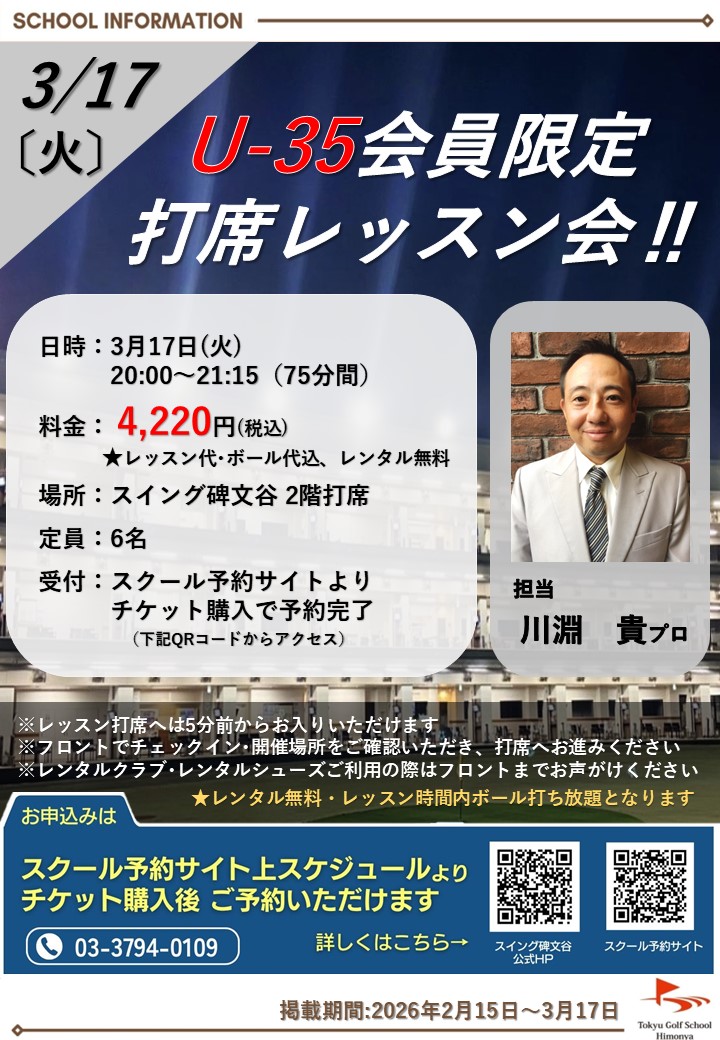 スイング碑文谷打席にて実施のU-35会員限定レッスン会のお知らせでございます。