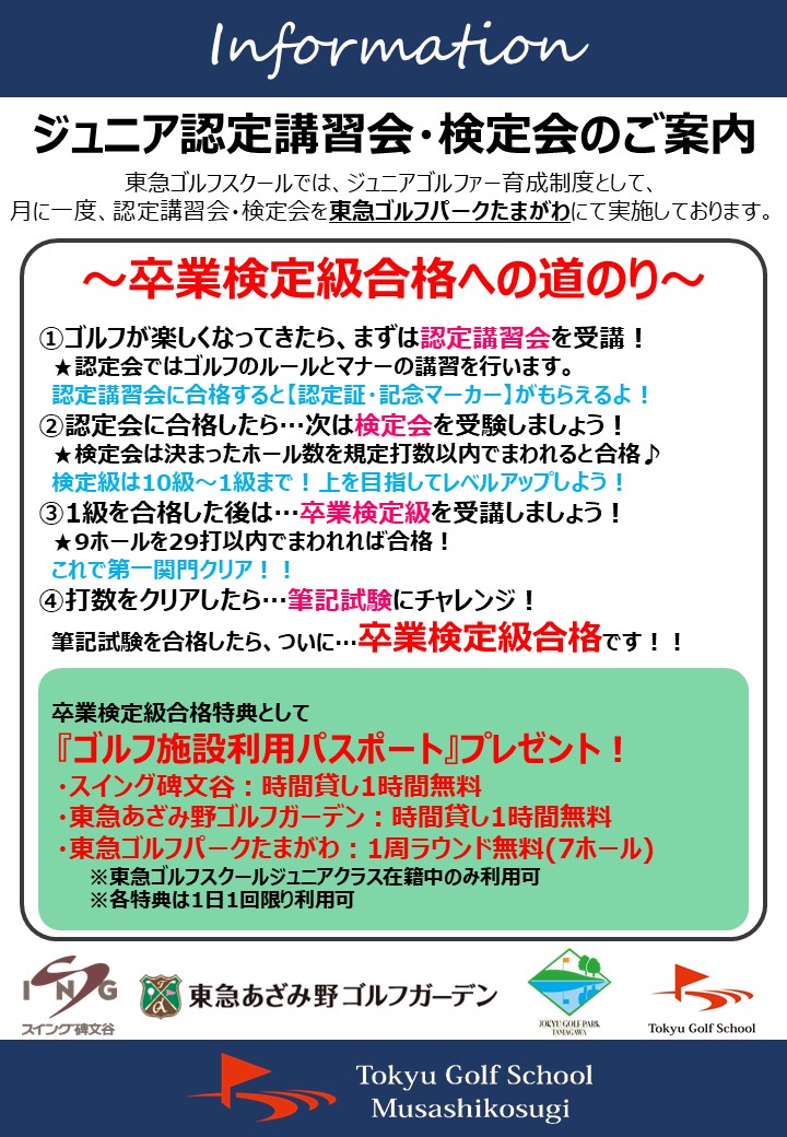 毎月1回東急ゴルフパークたまがわにて認定講習会・検定会を実施いたします。