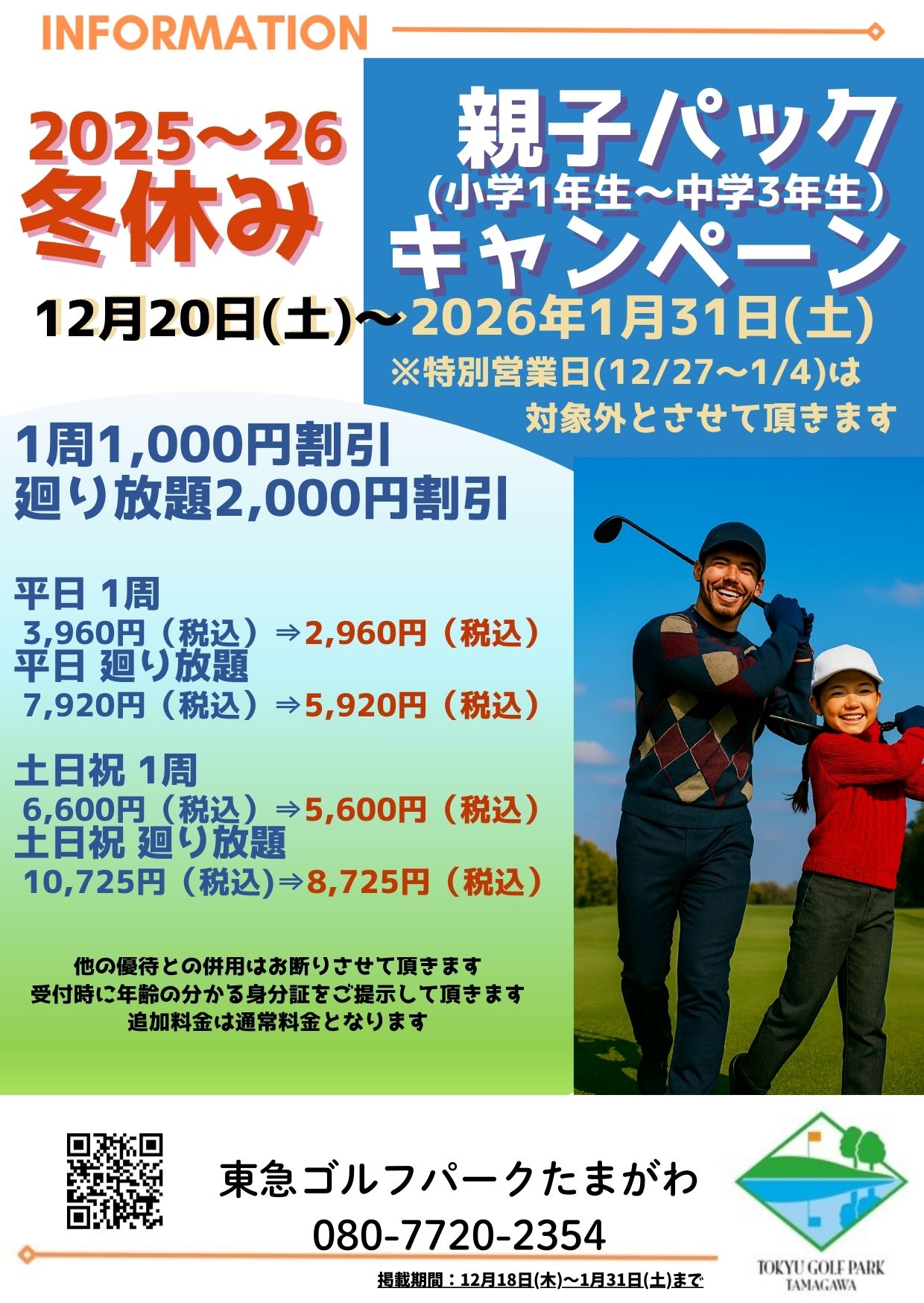 冬休みの親子パック(小学生~中学生まで)キャンペーンを12月20日(土)より実施いたします。