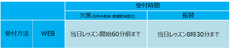 ※休会中の振替レッスンはご利用できません。又、退会後は振替のご利用できません。