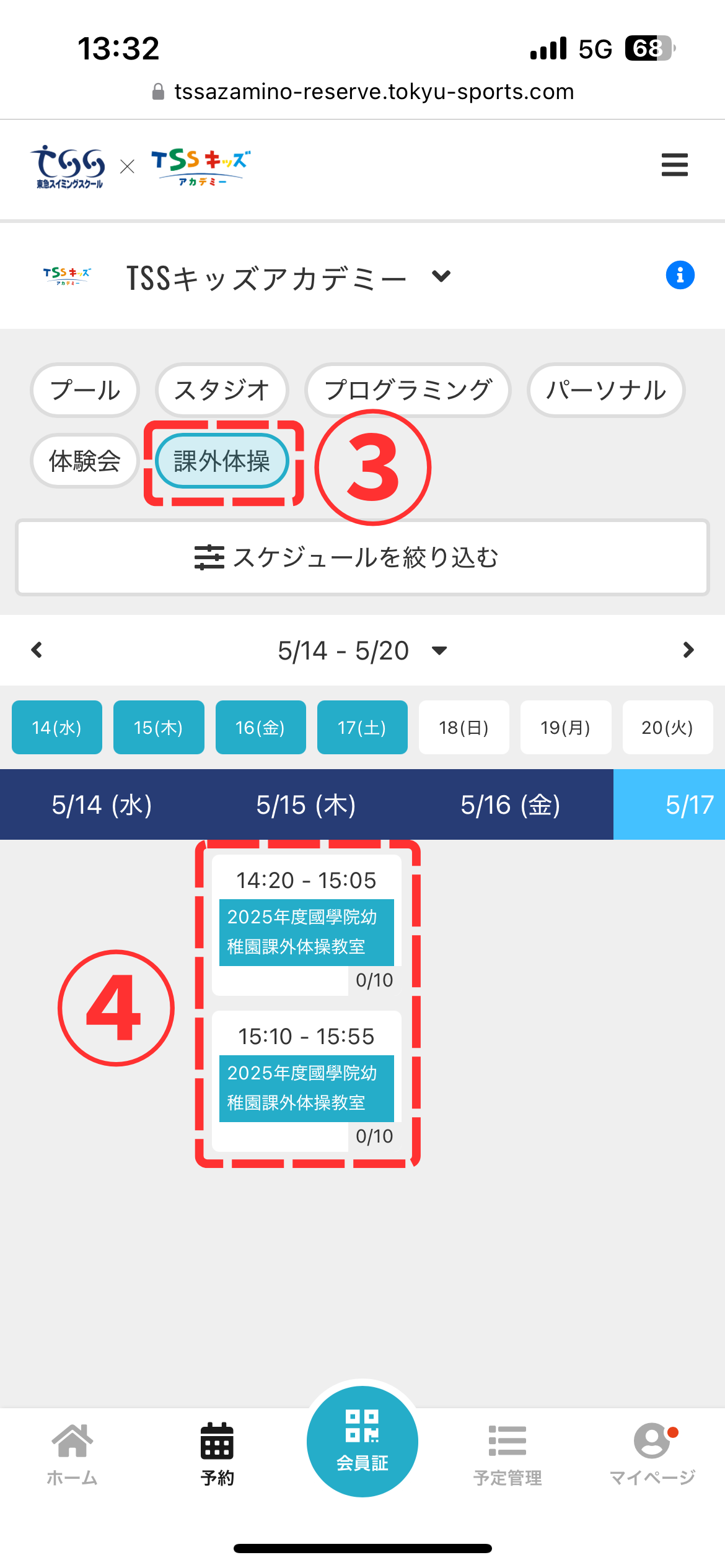 4. 各クールの初回日まで進み、希望の時間枠をタップ