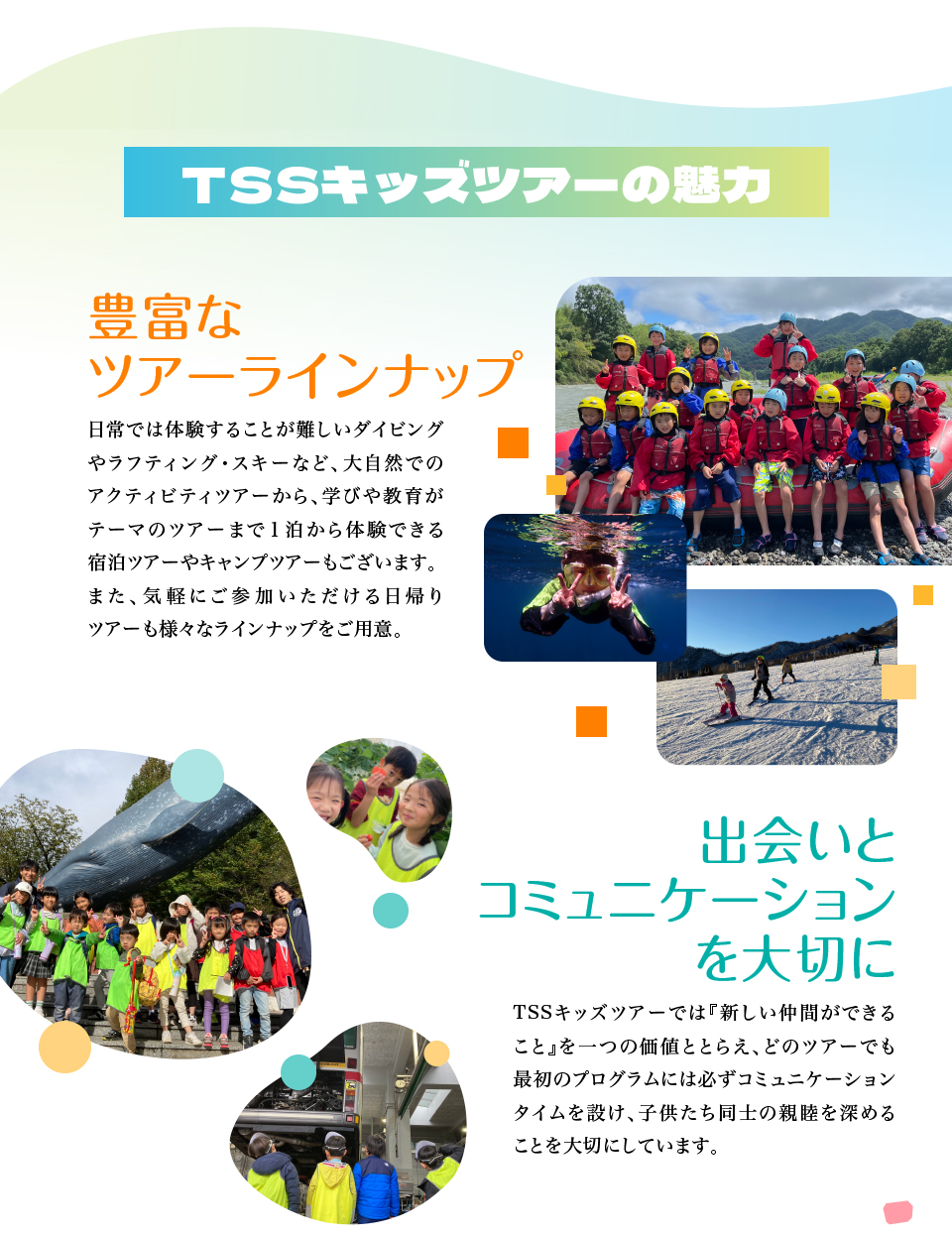 TSSキッズツアーは「新しい仲間との出会い」もコンセプトの1つとしておりますので、ツアーの最初は必ずコミュニケーションタイムを設け、ツアー中もレッスンだけでなくレクリエーションやホテルでの生活を通して、子供たち同士の絆が育まれるようにTSSキッズツアースタッフも全面バックアップをいたしますのでご安心ください。