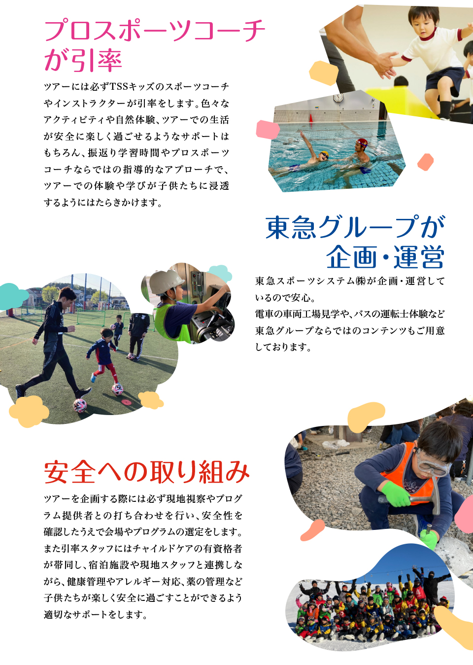引率スタッフは、ツアー専任スタッフおよび当社スポーツ事業のコーチ、これまでにコーチや子ども向けイベントの運営経験があるスタッフで構成しています。