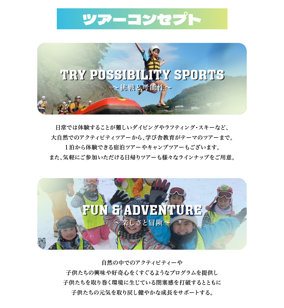 お泊りが初めてのお子様の参加は大歓迎です。宿泊ツアーでの経験豊富なスタッフが、生活面もしっかりバックアップいたします。不安な方には初めてお泊りをするお子様を対象としたツアーもございます。
