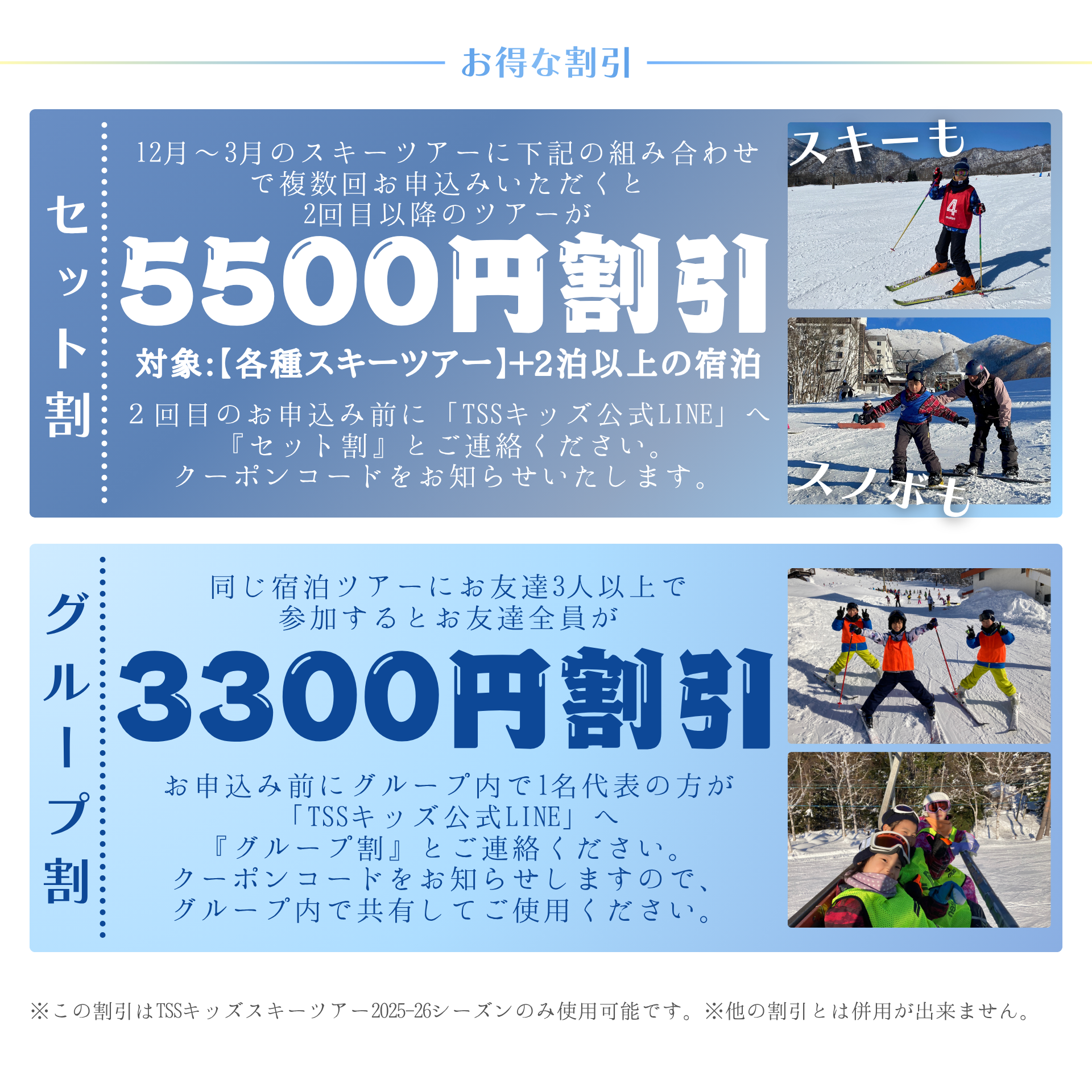 集合場所から現地までの移動やホテルでの生活は、お子様7・8名に1人の割合でTSSキッズツアースタッフがお子様のサポートをいたします。また、スキー&スノーボードでは10名以下のグループに現地のインストラクターとTSSキッズツアースタッフの2名体制でレッスンを行います。