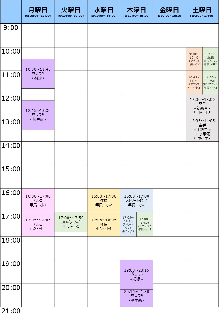 ※泳法スキルアップ・空手上級・成人フラの初中級へのご変更はスクールにご連絡ください。