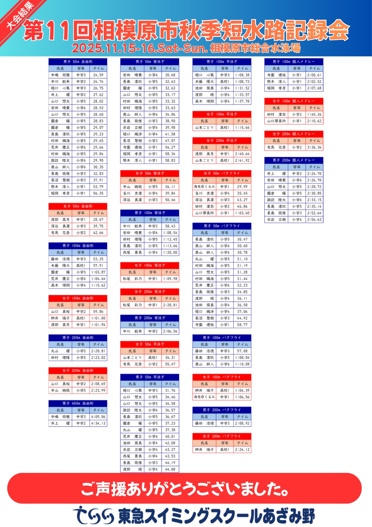 >選手・大会関連ニュース>【神奈川県】第11回相模原市秋季短水路記録会 結果