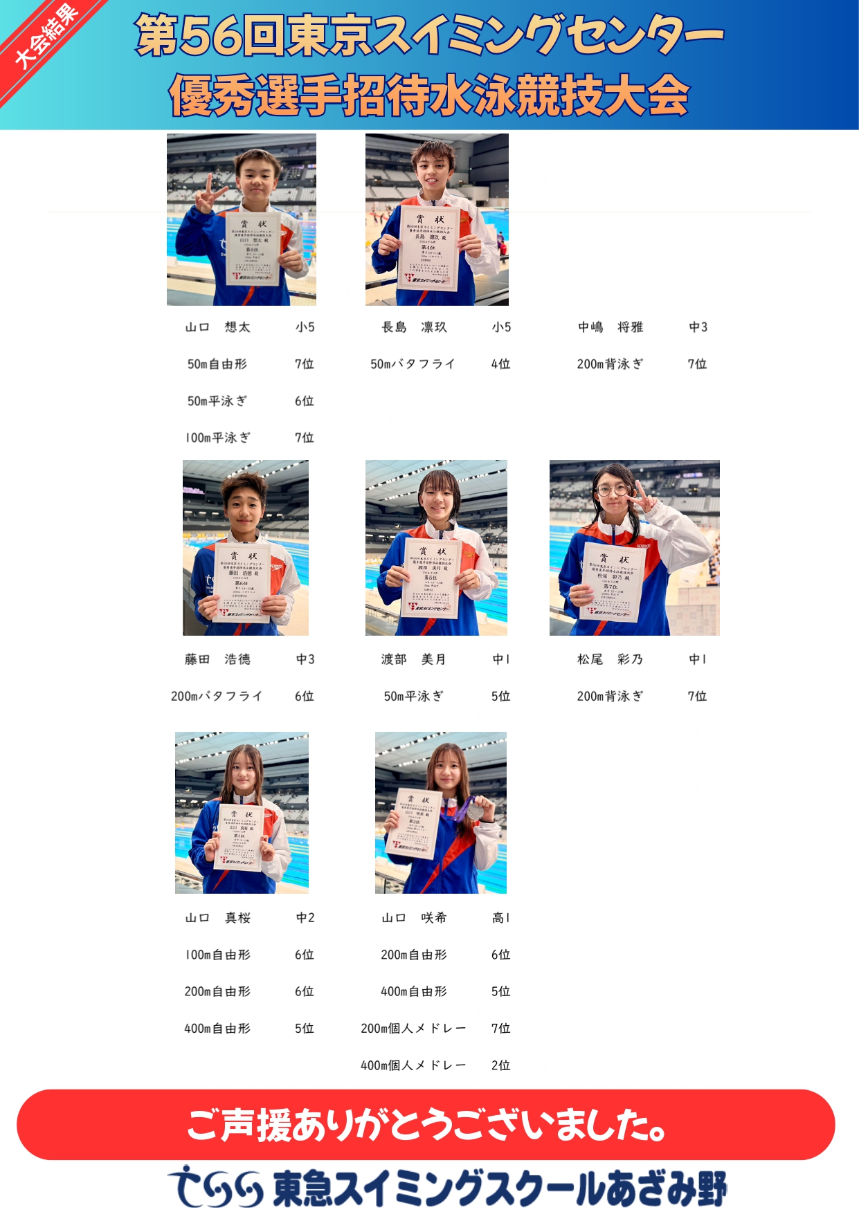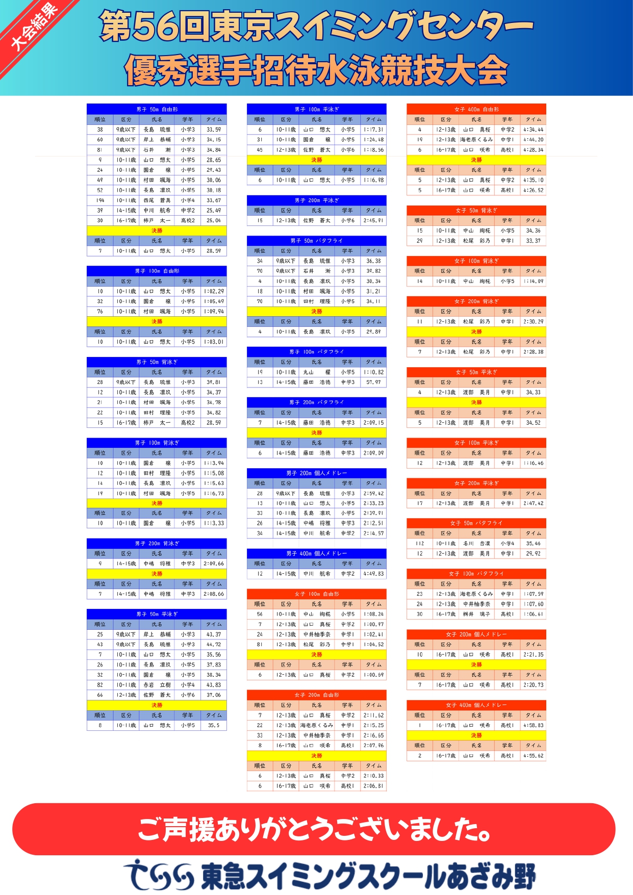 【全国】第56回東京スイミングセンター優秀選手招待水泳競技大会 結果
