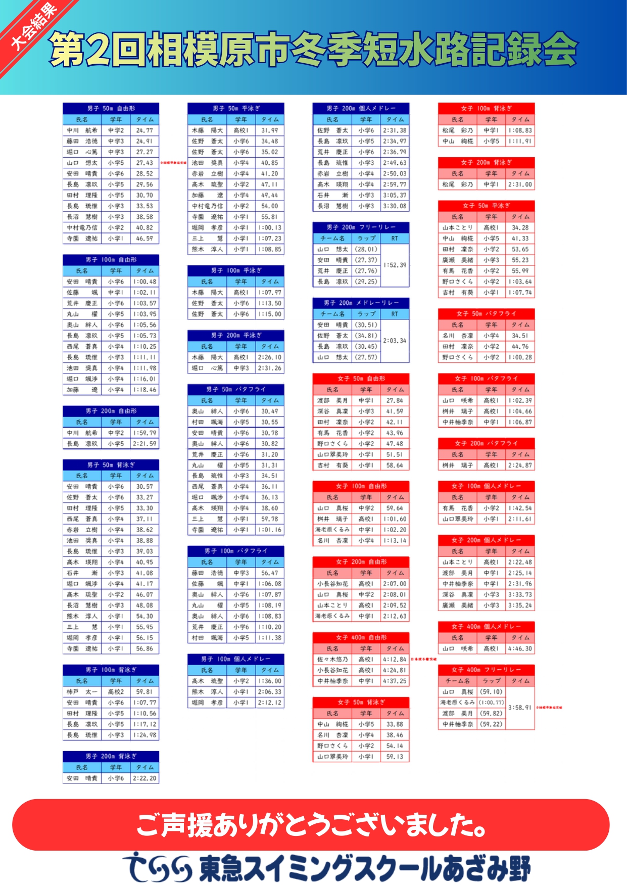 【神奈川】第2回相模原市冬季短水路記録会 結果