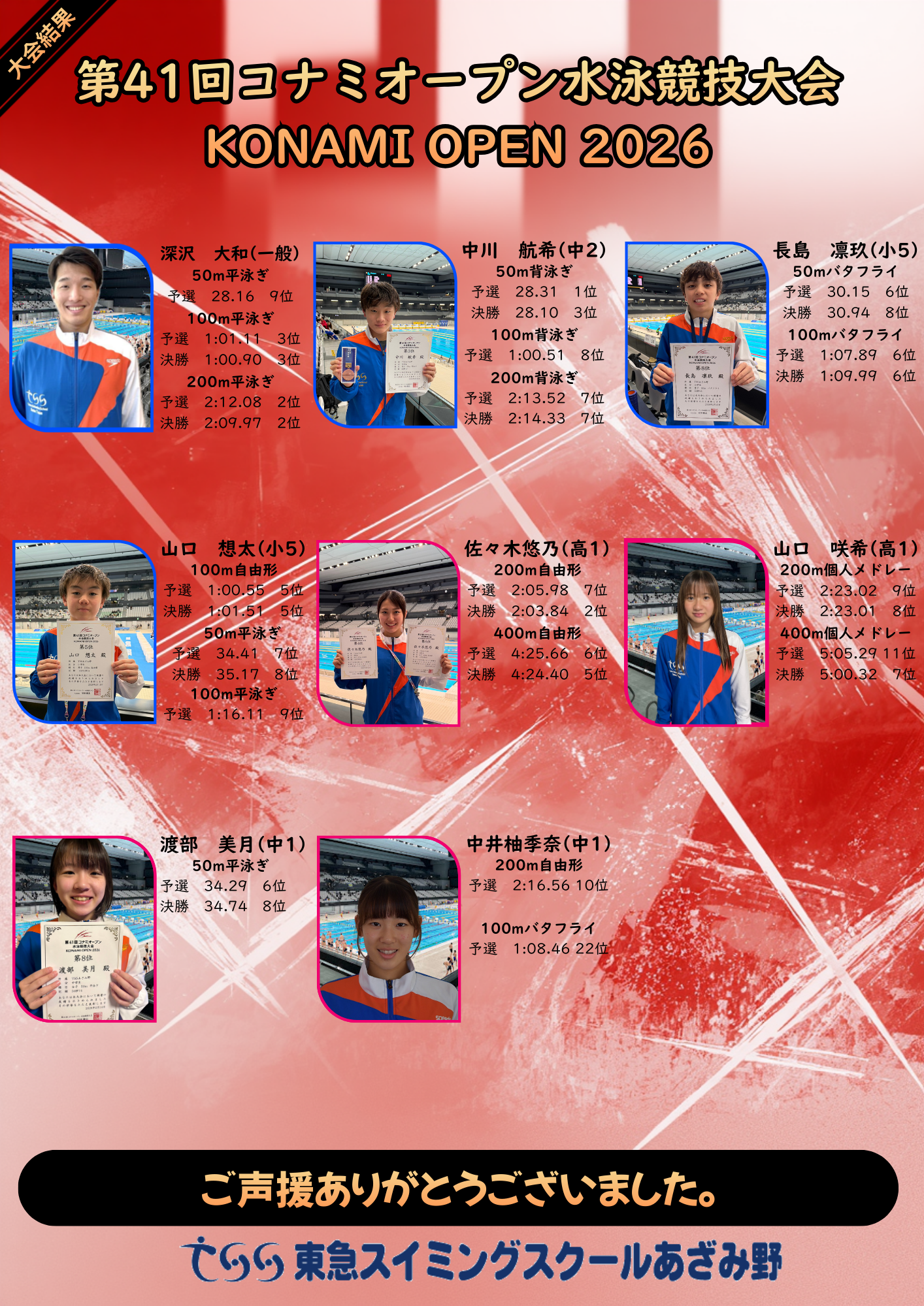 2026.02.14-15に東京アクアティクスセンターにて、コナミオープン2026が実施されました。 本競技会は全国から高い標準記録を突破した選手が集まり実施する大会となり、3月に実施される日本選手権の前哨戦と位置づけられております。 当スクールから、8名の選手が出場し、14種目で決勝に進出いたしました。 3月の全国大会に向けて、課題もでる競技会となりました。