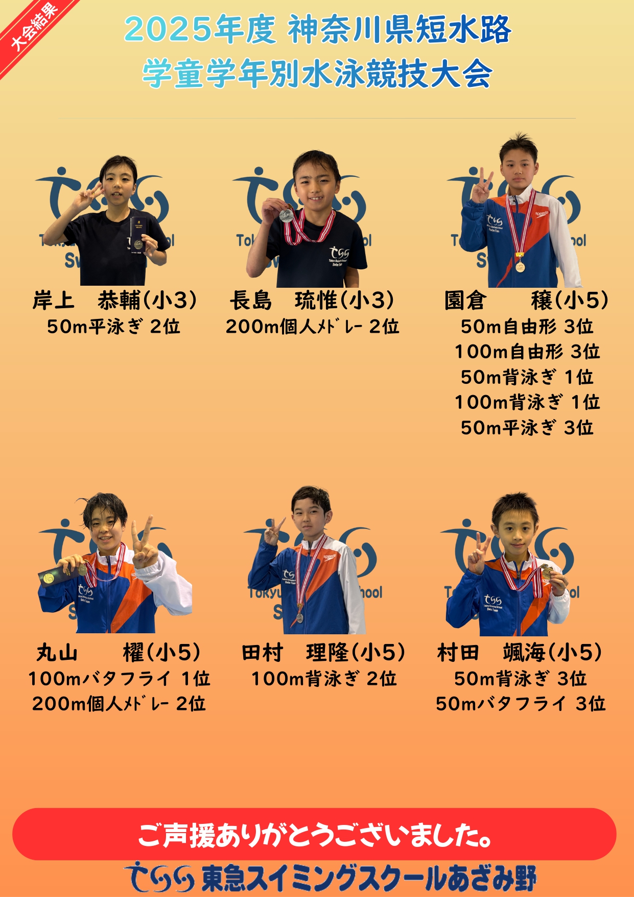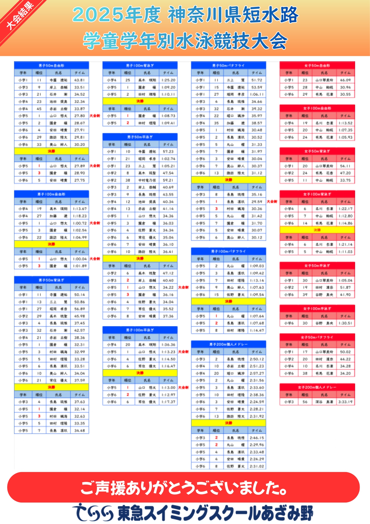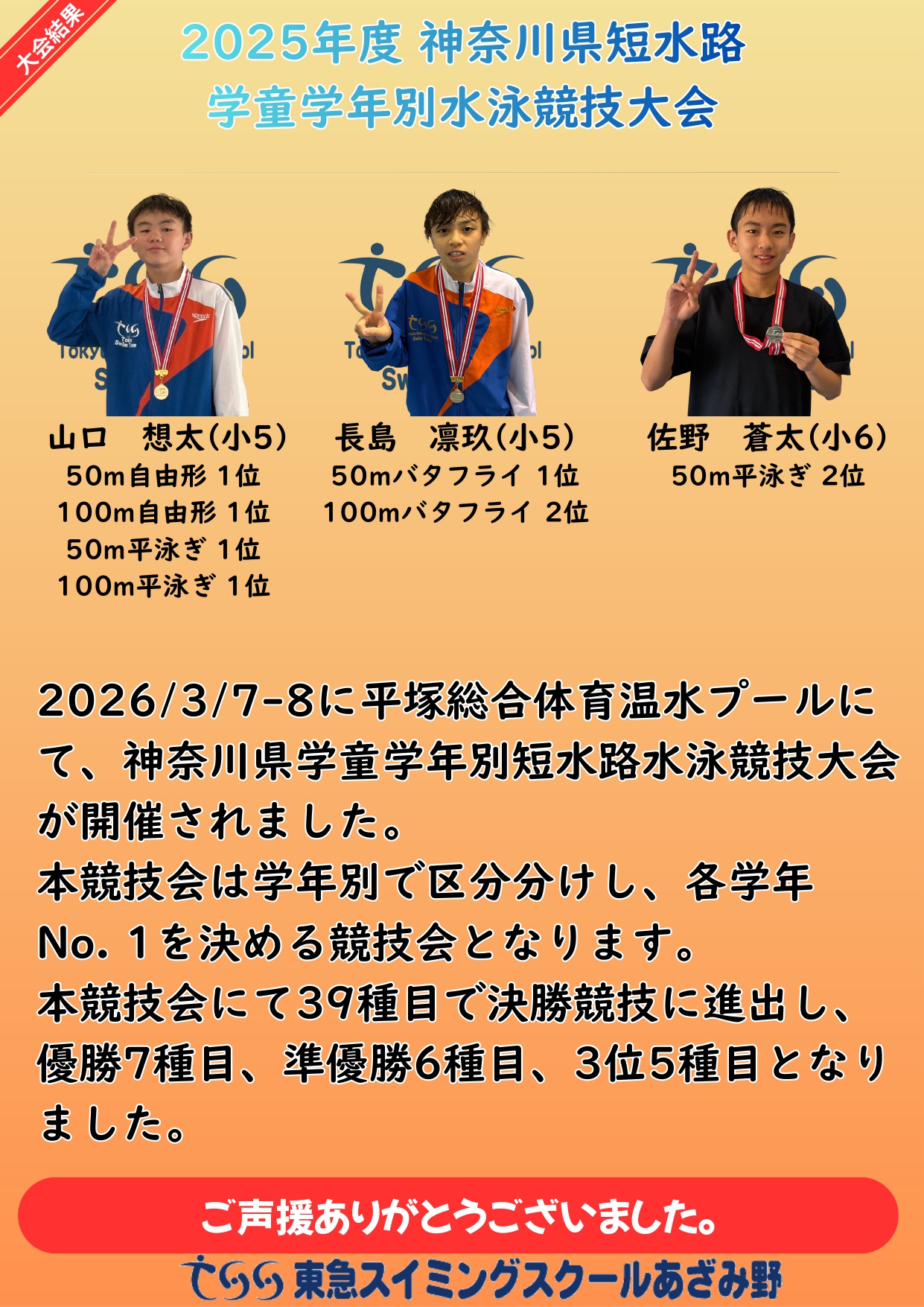 2026/3/7・8に平塚総合体育温水プールにて、 神奈川県学童学年別短水路水泳競技大会が開催されました。 本競技会は学年別で区分分けし、各学年No. 1を決める競技会となります。 本競技会にて39種目で決勝競技に進出し、優勝7種目、準優勝6種目、3位5種目となり ました。
