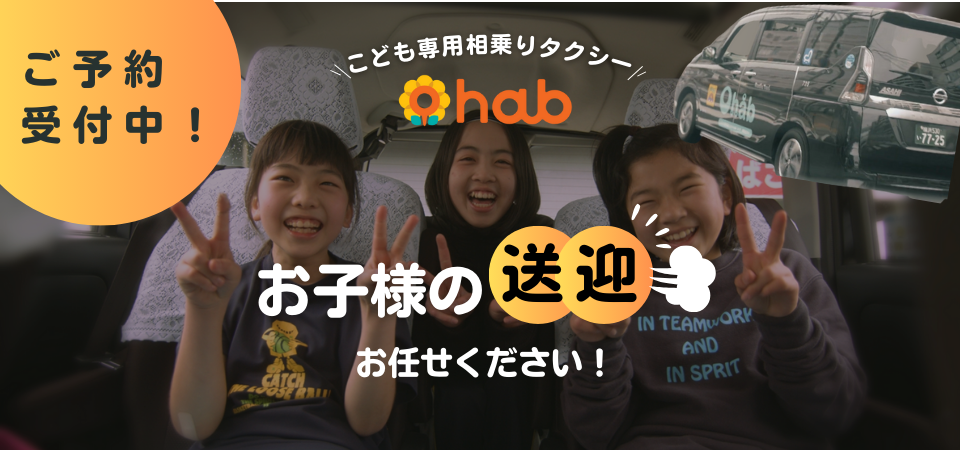 タクシーを地域みんなの送迎車両に。habは、テクノロジーを活用した新しい「こども専用のタクシー送迎サービス」です。地域のご家庭の送迎環境に合わせてAIが運行ルートを毎月作成。地域のお子様がタクシーに相乗りして習い事や病院など目的地へ行くことができます。