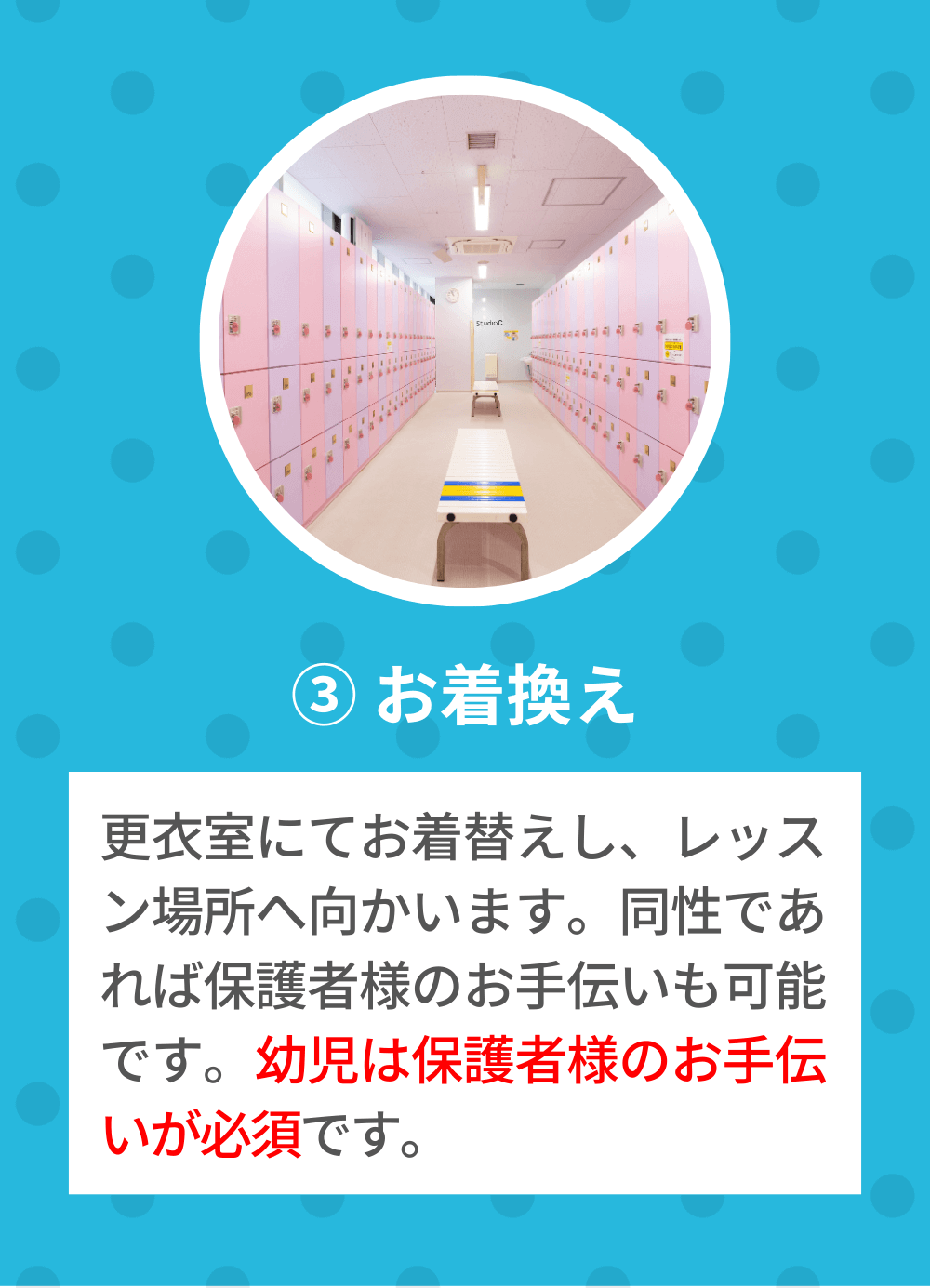 お子さまと同性の保護者様であれば更衣室でお手伝いが可能です。※幼児は保護者様のお手伝いが必須です。
