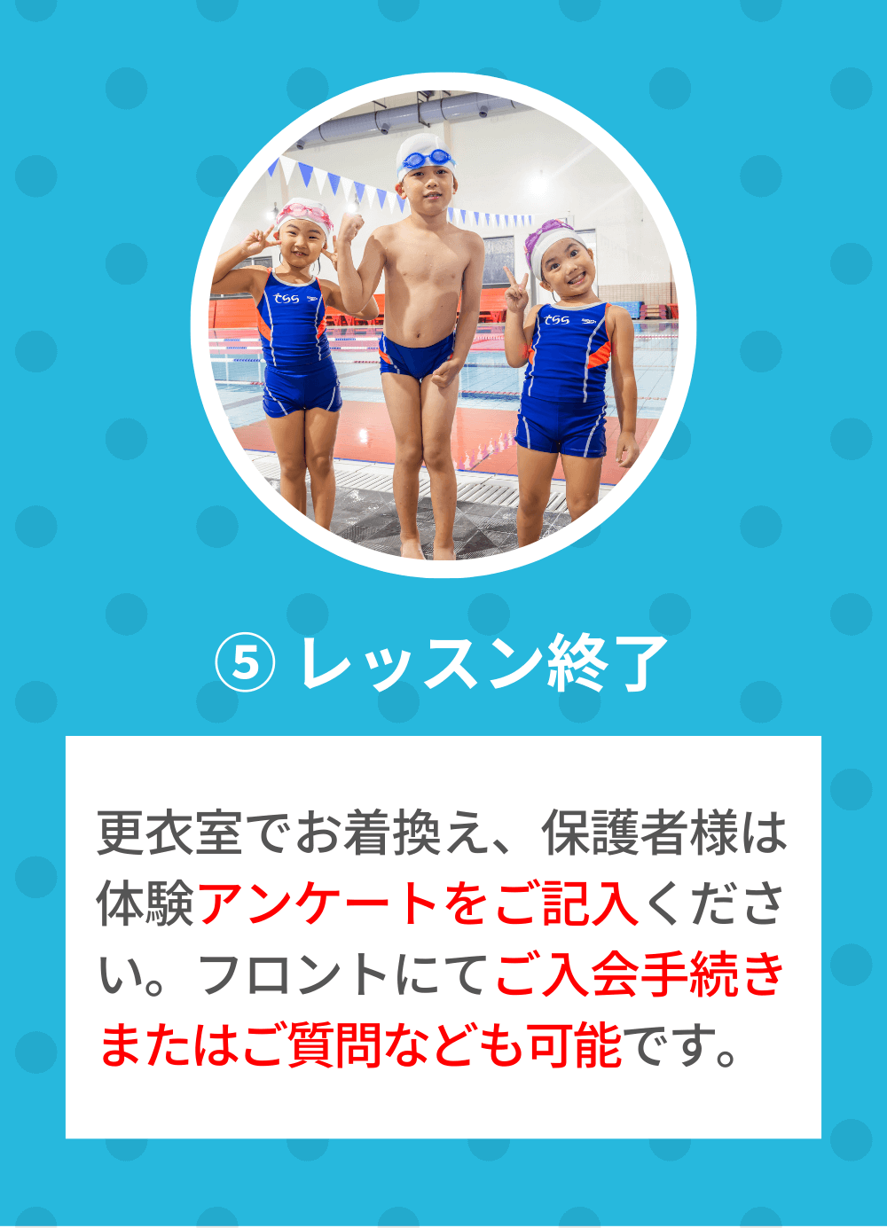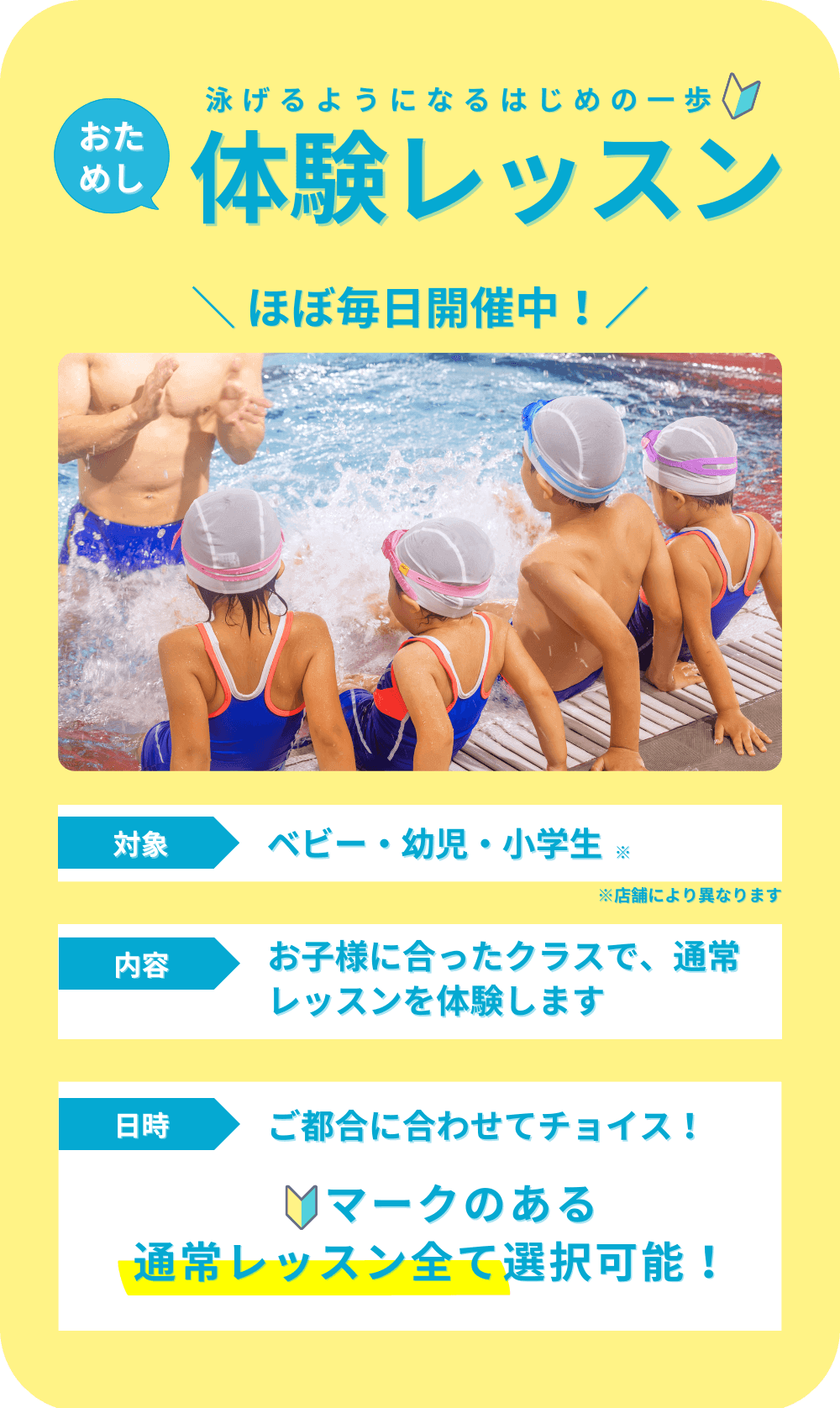 他のスイミングスクールのご経験があっても問題ございません。体験予約時のアンケートにてお知らせください。