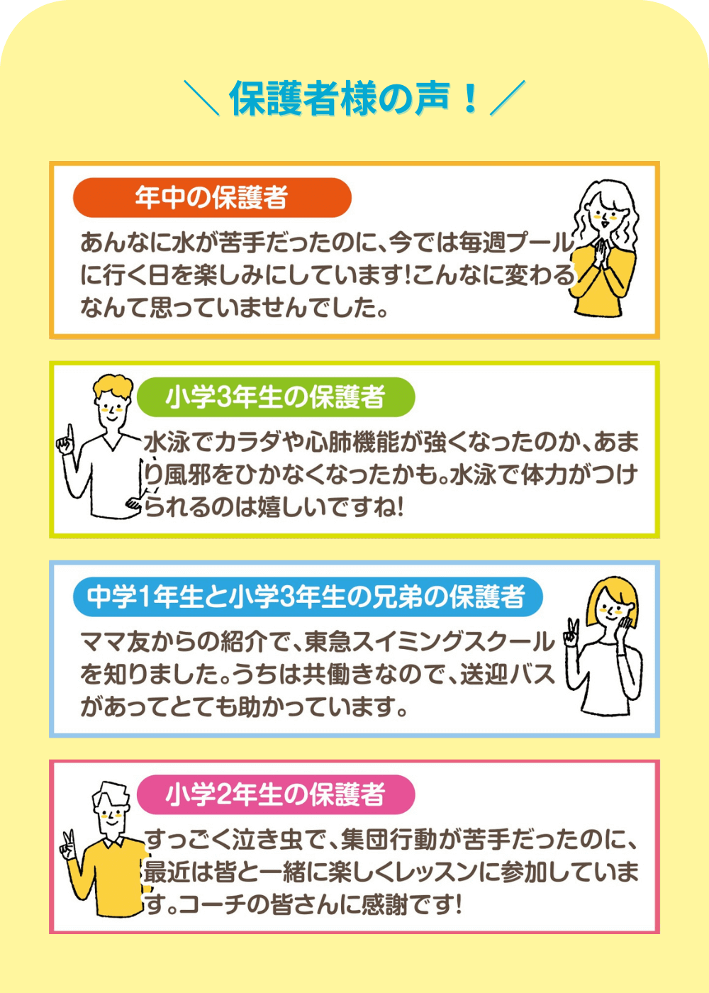 スイミングはもちろん習い事が初めての方でも問題ございません。気になる点はお気軽にお問い合わせください。