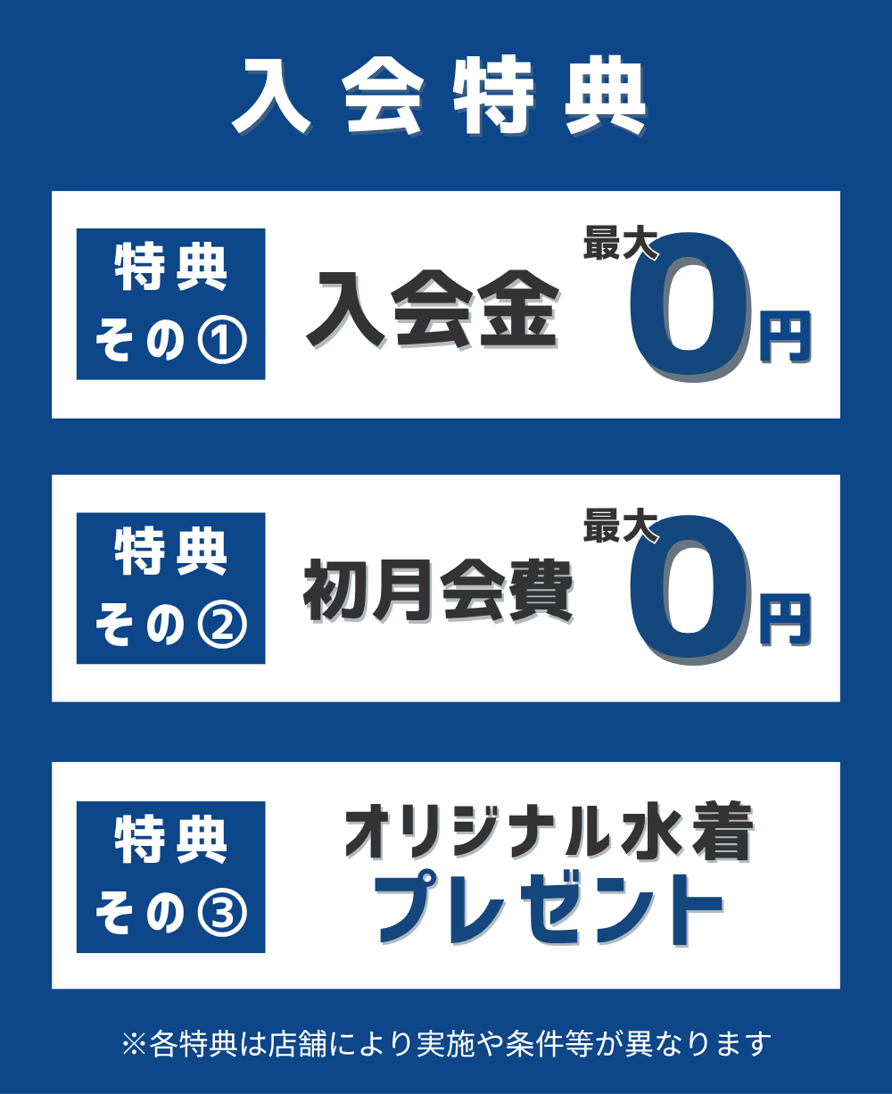 水着・水泳キャップ・タオル・水筒(ペットボトル可)をご用意ください。※水泳キャップは体験用もご用意がございます。