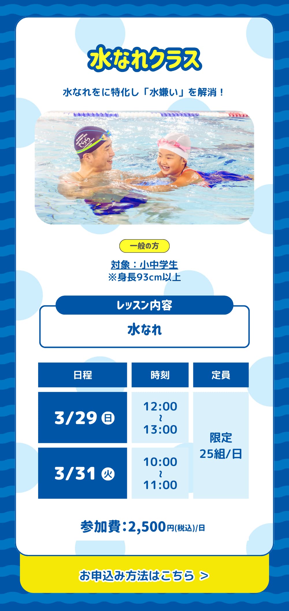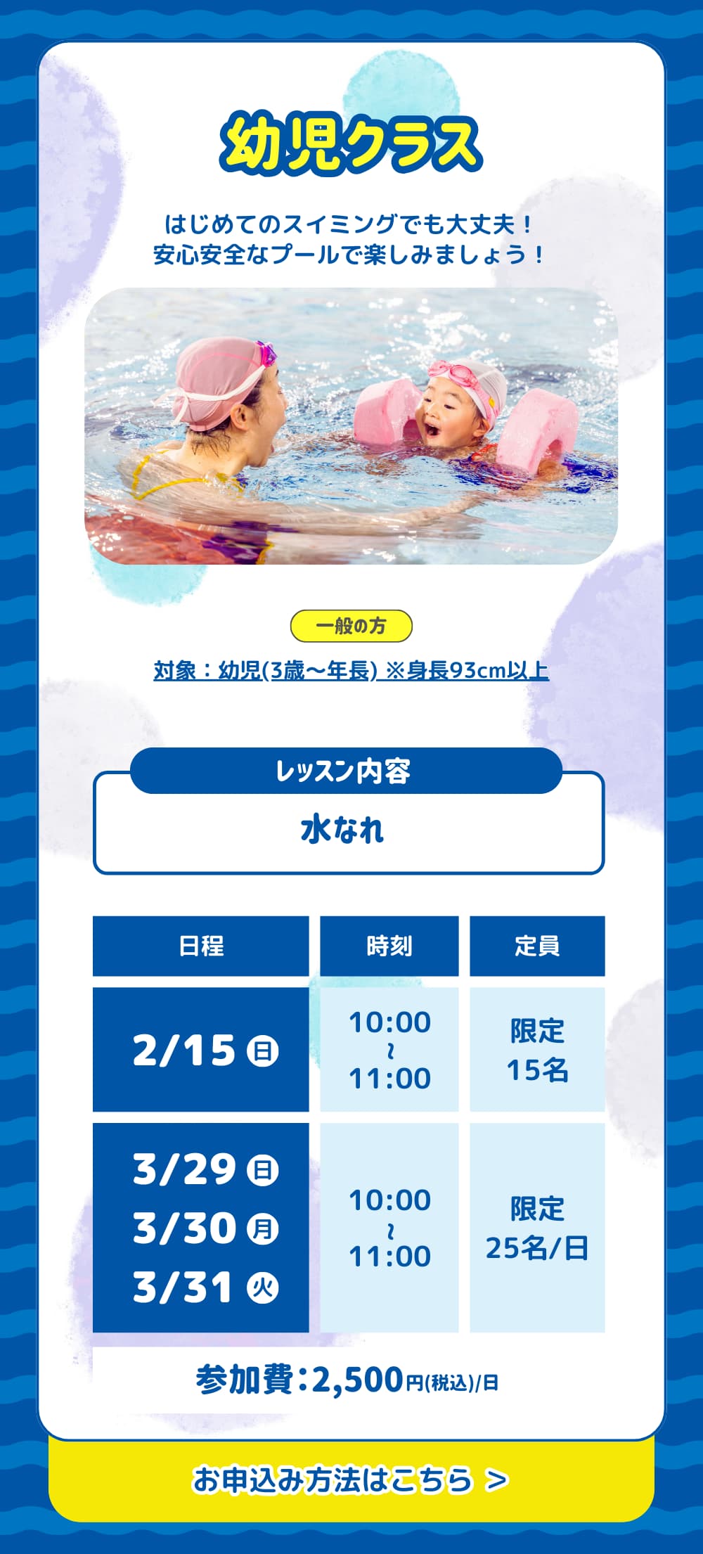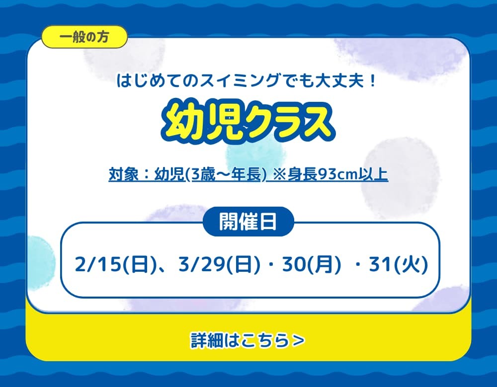 水着・キャップ・タオル・水筒(ペットボトル可)をご用意ください。