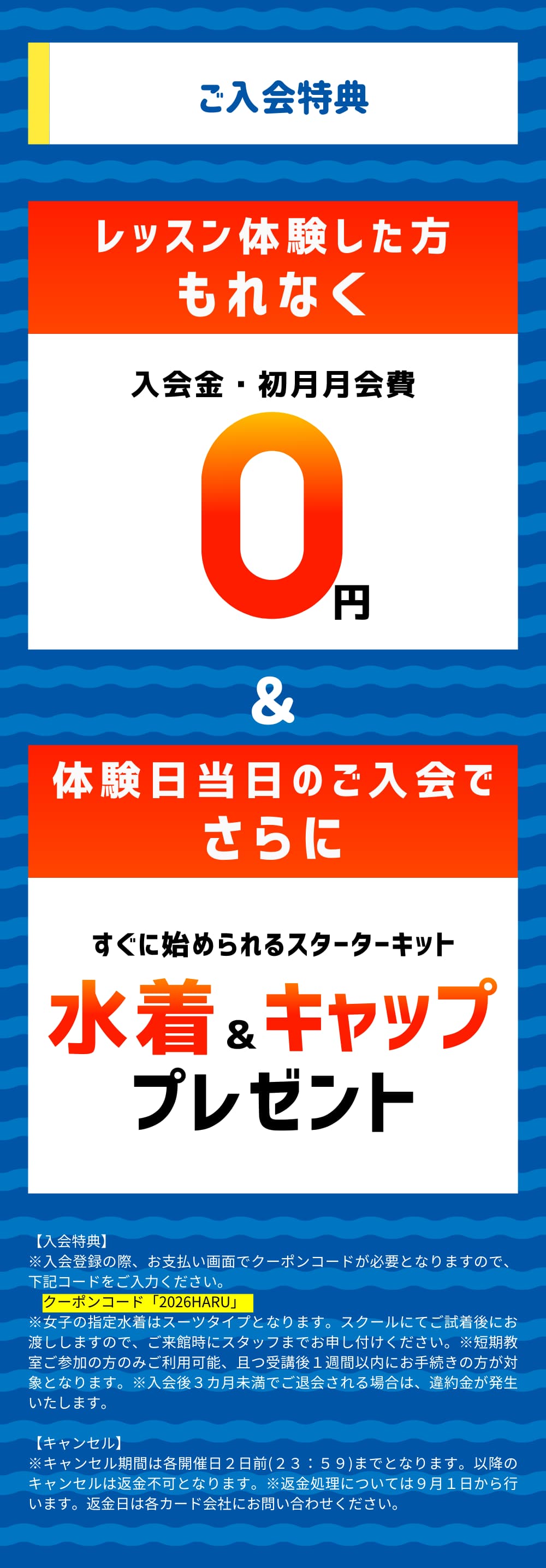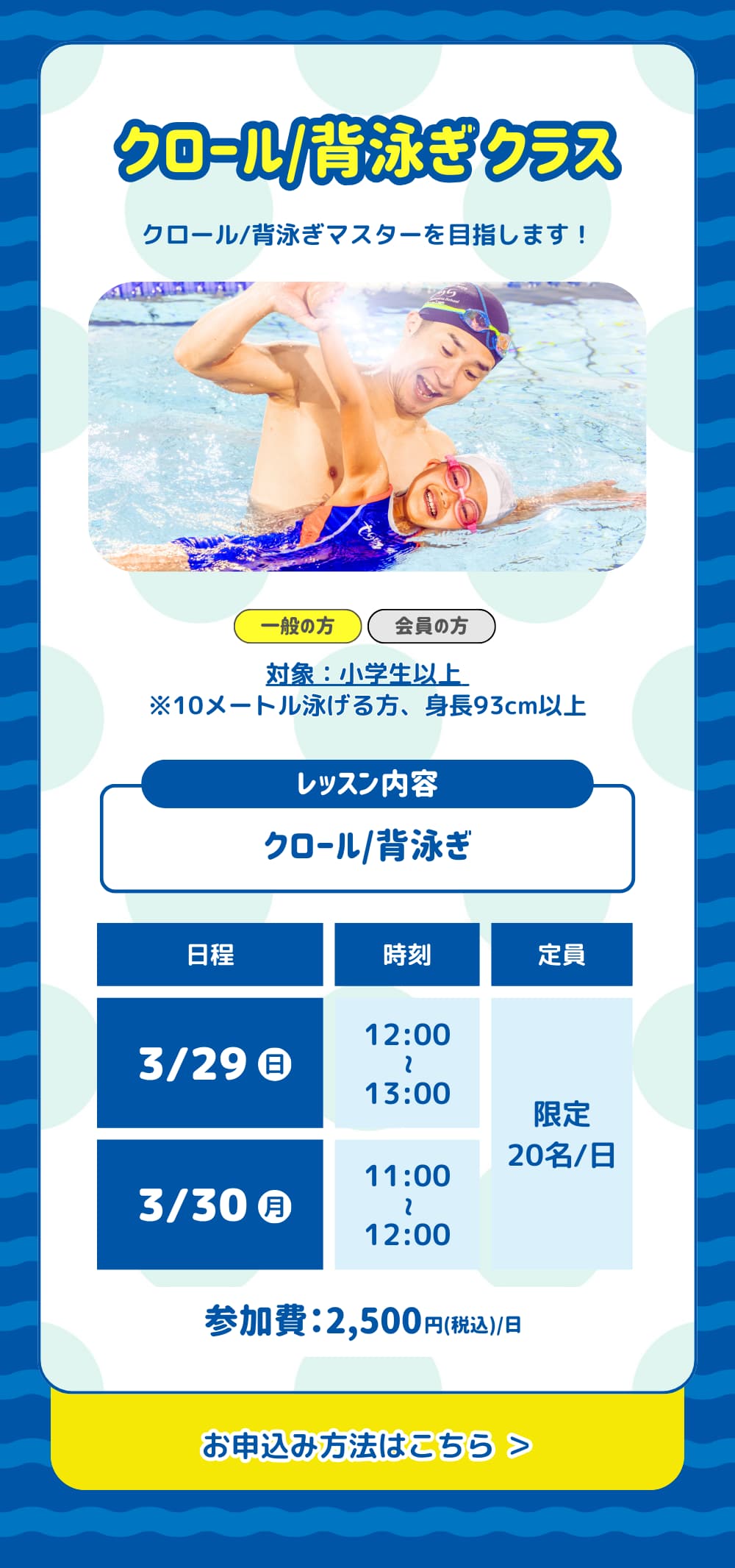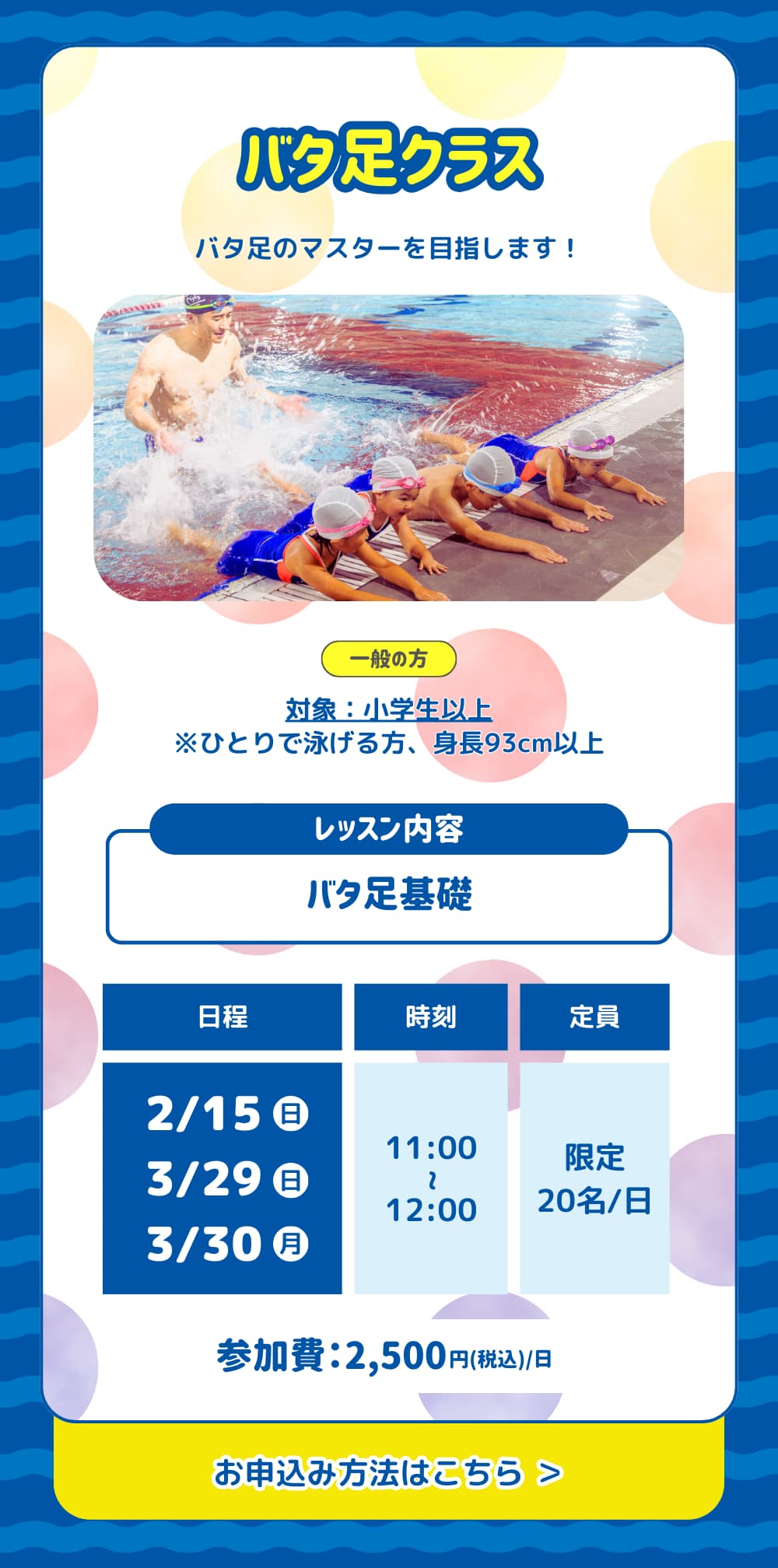 水着・キャップ・タオル・水筒(ペットボトル可)をご用意ください。