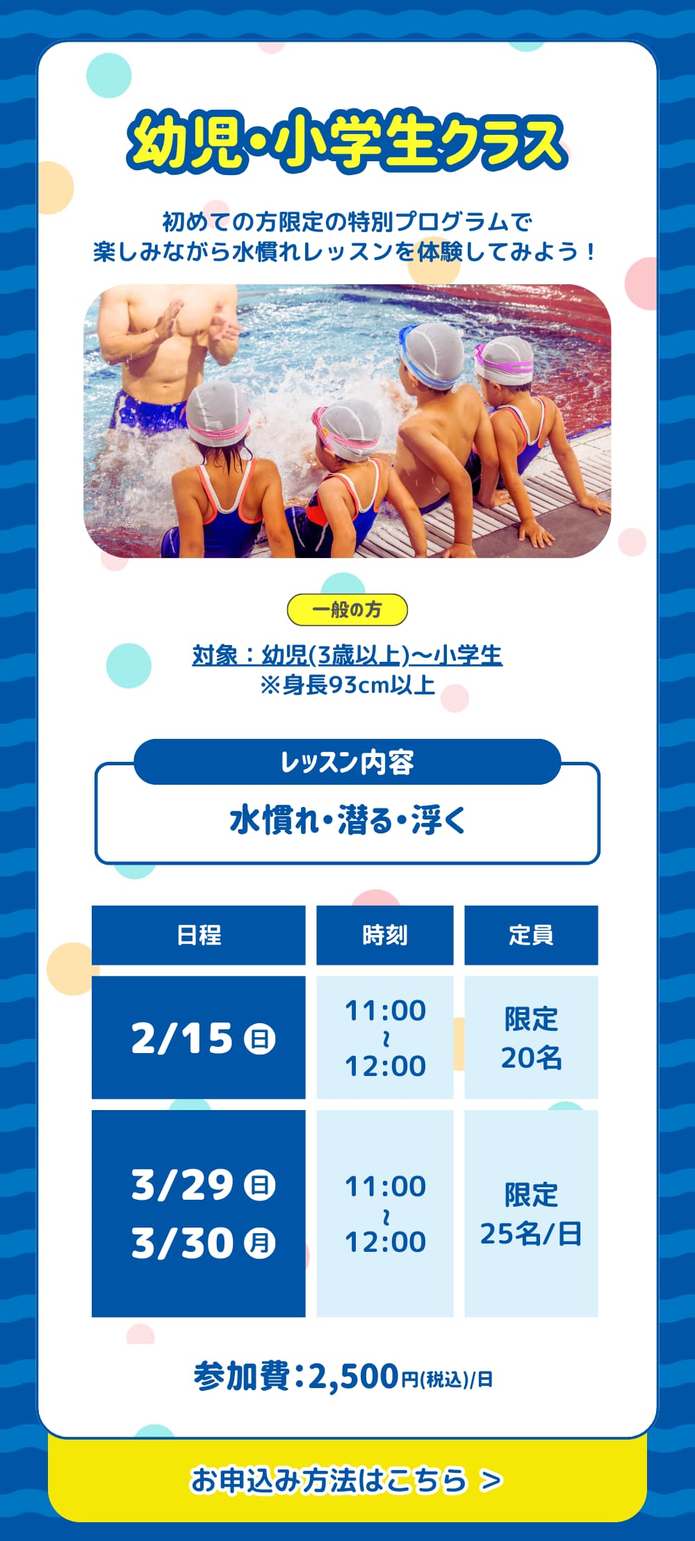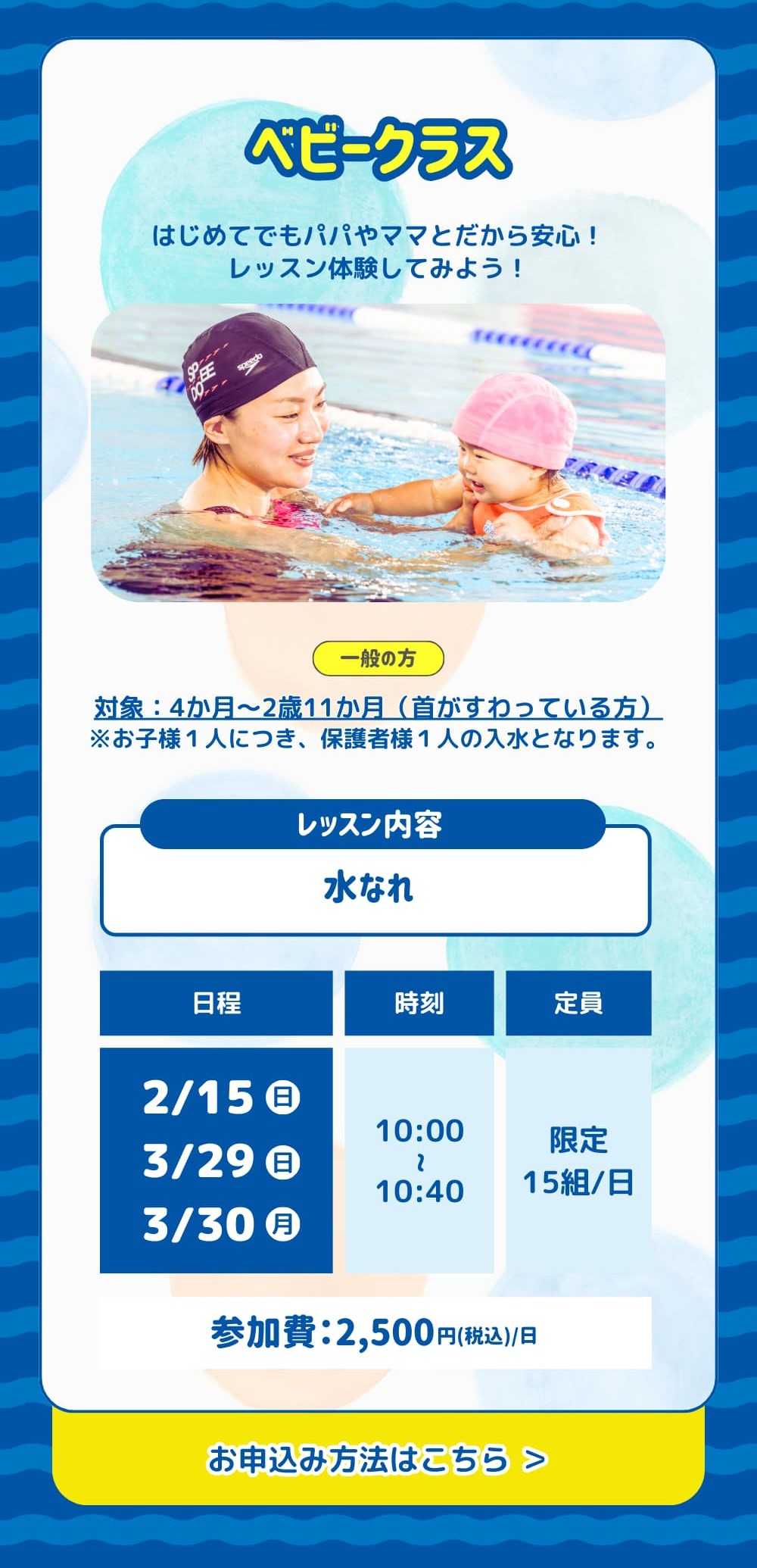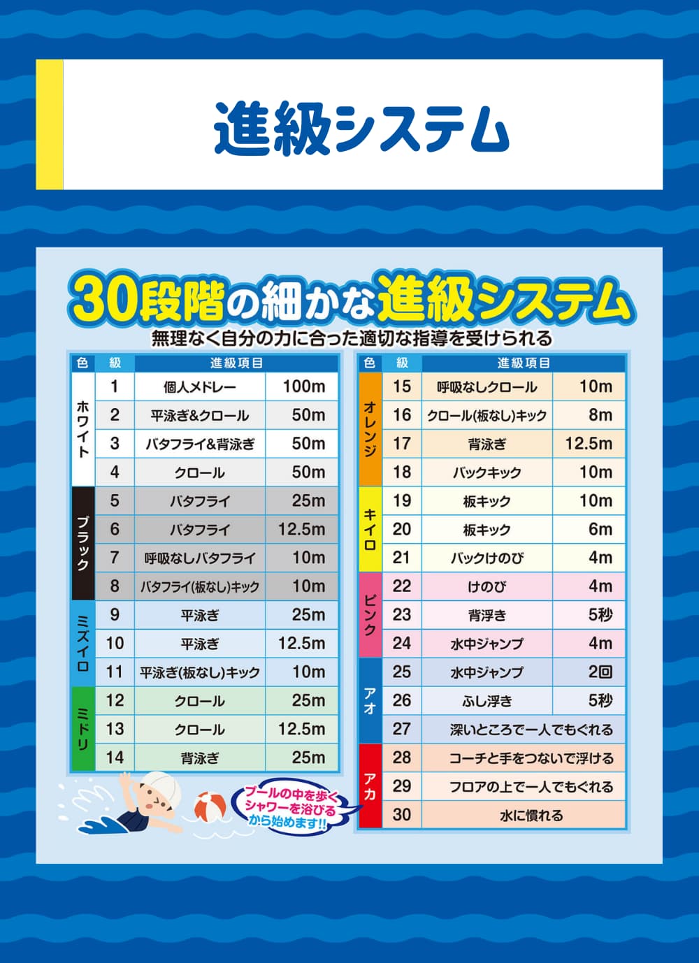 お子さまの状況に合わせ、水慣れから始められますのでご安心ください。