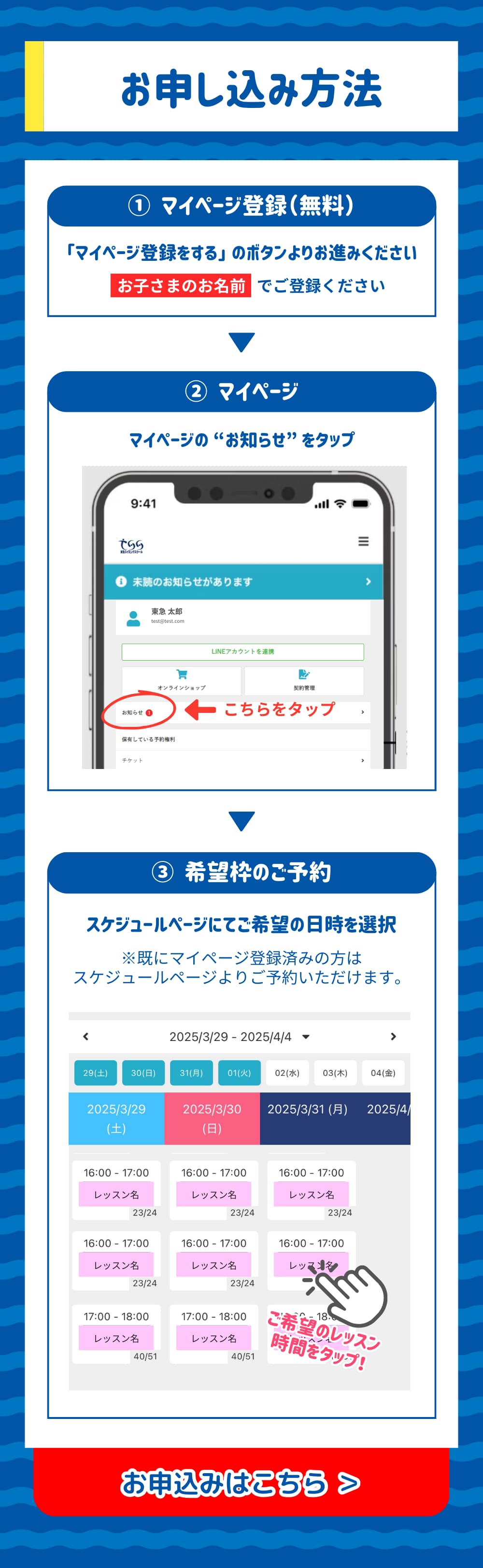 スイミングはもちろん習い事が初めての方でも問題ございません。気になる点はお気軽にお問い合わせください。