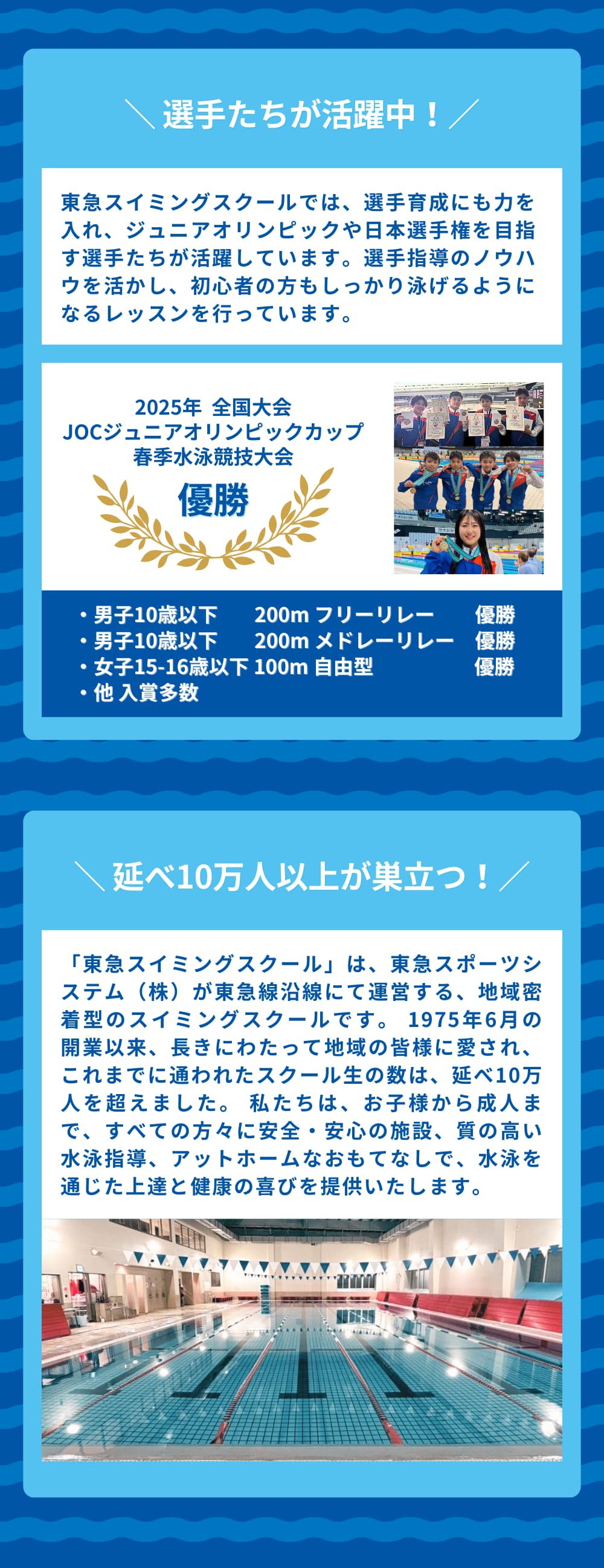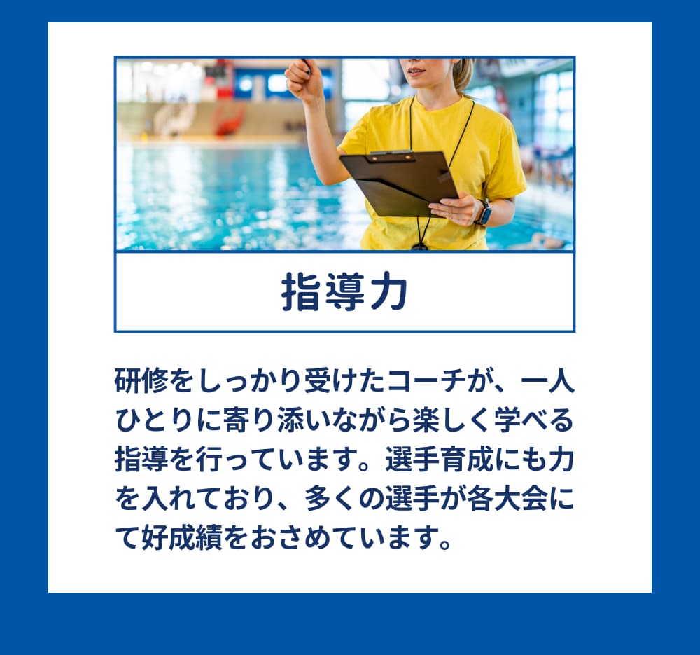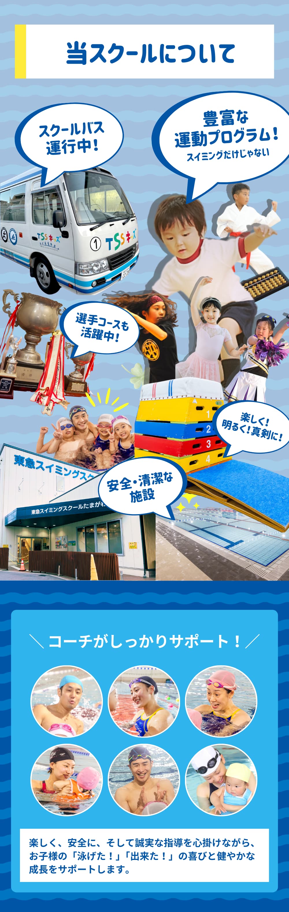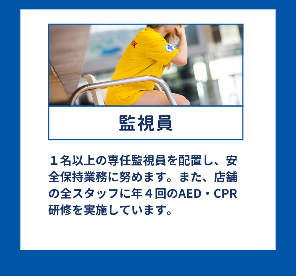 お子さまの笑顔と安心を守るために、水質管理からコーチの質まで徹底。異常を未然に防ぎ、万が一の緊急時もすぐ対応できる体制で、安心できる安全なスクールです。