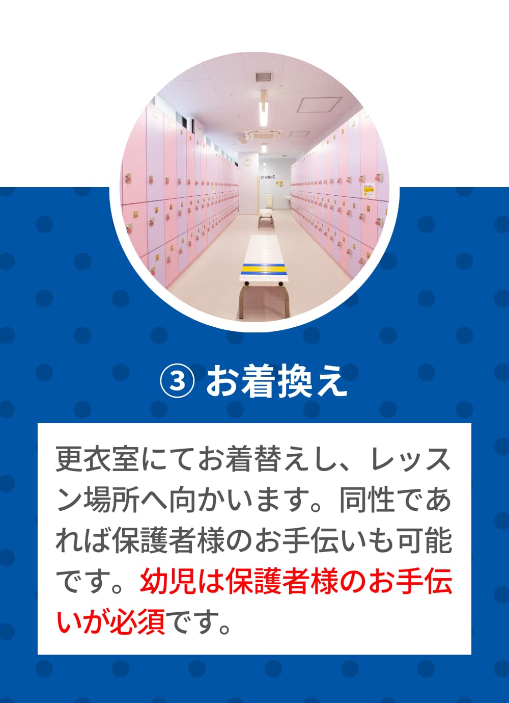 お子さまと同性の保護者様であれば更衣室でお手伝いが可能です。※幼児は保護者様のお手伝いが必須です。