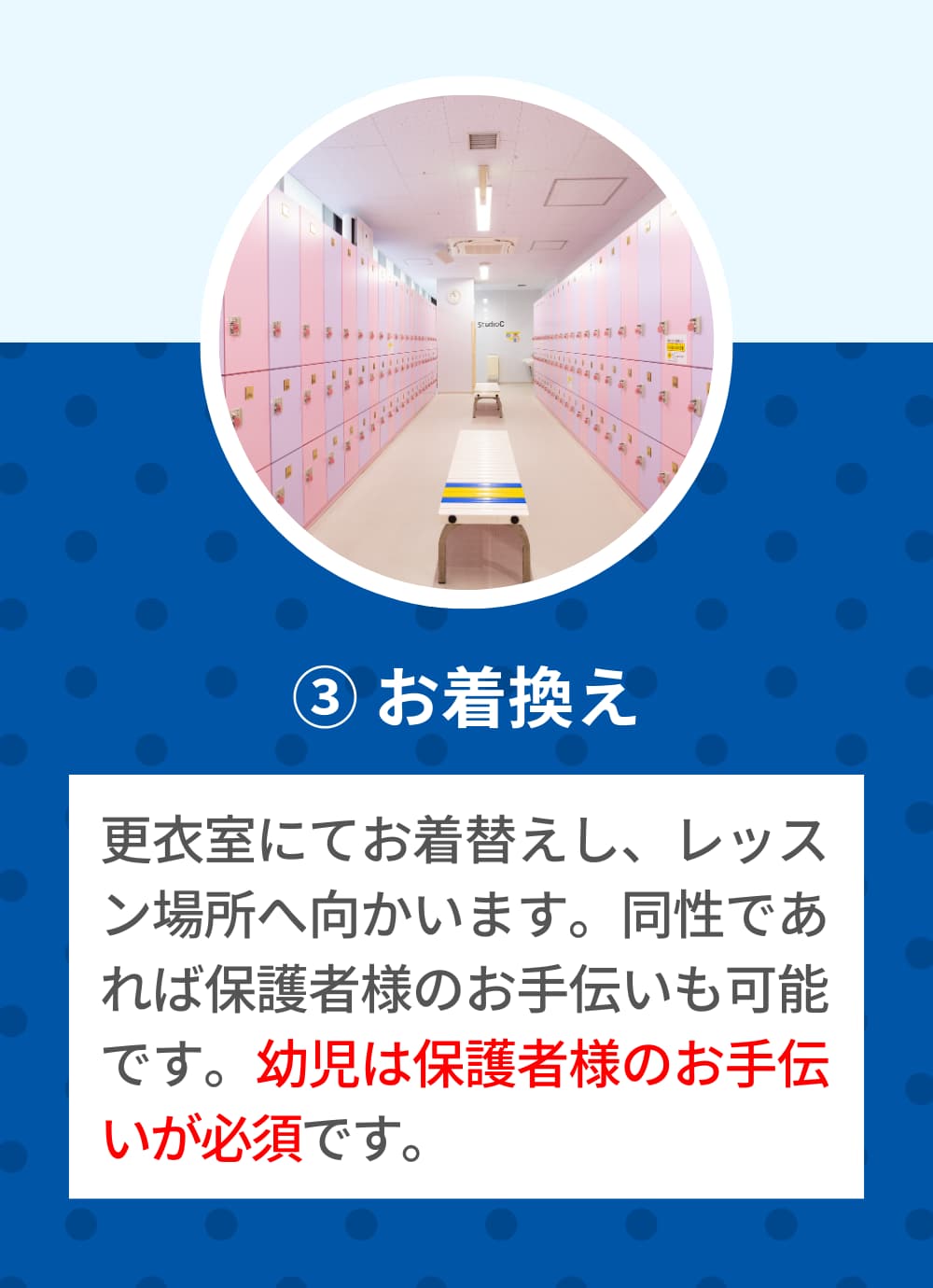 お子さまと同性の保護者様であれば更衣室でお手伝いが可能です。※幼児は保護者様のお手伝いが必須です。